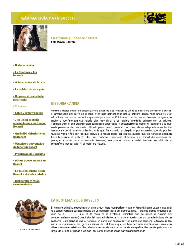 Historia canina La Neotenia y los bassets Antecedentes de la raza La utilidad de esta gua Un perro al que slo le falta hablar Cuidados Salud y enfermedades Es usted el dueo adecuado para un Basset Hound? Quin NO debera tener un Basset Ventajas y desventajas de tener un Basset Problemas de conducta Dnde puedo adquirir un Basset Lo que se espera de un Basset a distintas edades Bibliografa y sitios recomendados