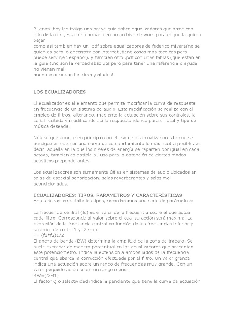 LOS ECUALIZADORES El ecualizador es el elemento que permite modificar la curva de respuesta en frecuencia de un sistema de audio. Esta modificacin se realiza con el empleo de filtros, alterando, mediante la actuacin sobre sus controles, la seal recibida y modificando as la respuesta idnea para el local y tipo de msica deseada. Ntese que aunque en principio con el uso de los ecualizadores lo que se persigue es obtener una curva de comportamiento lo ms neutra posible, es decir, aquella en la que los niveles de energa se reparten por igual en cada octava, tambin es posible su uso para la obtencin de ciertos modos acsticos preponderantes. Los ecualizadores son sumamente tiles en sistemas de audio ubicados en salas de especial sonorizacin, salas reverberantes y salas mal acondicionadas. ECUALIZADORES: TIPOS, PARMETROS Y CARACTERSTICAS Antes de ver en detalle los tipos, recordaremos una serie de parmetros: La frecuencia central (fc) es el valor de la frecuencia sobre el que acta cada filtro. Corresponde al valor sobre el cual su accin ser mxima. La expresin de la frecuencia central en funcin de las frecuencias inferior y superior de corte f1 y f2 ser: F= (f1*f2)1/2 El ancho de banda (BW) determina la amplitud de la zona de trabajo. Se suele expresar de manera porcentual en los ecualizadores que presentan este potencimetro. Indica la extensin a ambos lados de la frecuencia central que abarca la correccin efectuada por el filtro. Un valor grande indica una actuacin sobre un rango de frecuencias muy grande. Con un valor pequeo acta sobre un rango menor. BW=(f2-f1) El factor Q o selectividad indica la pendiente que tiene la curva de actuacin
