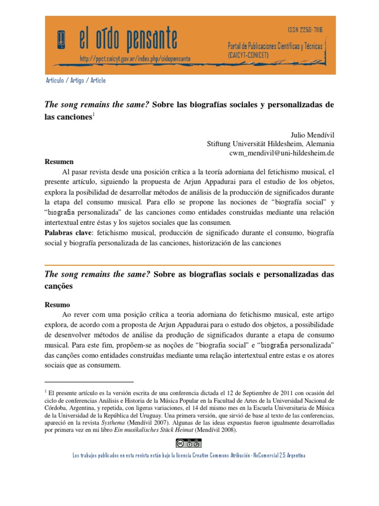 Cmo citar / Como citar / How to cite Mendvil, Julio. 2013. The song remains the same? Sobre las biografas sociales y personalizadas de las canciones. El odo pensante 1 (2). http://ppct.caicyt.gov.ar/index.php/ oidopensante [consulta: FECHA].