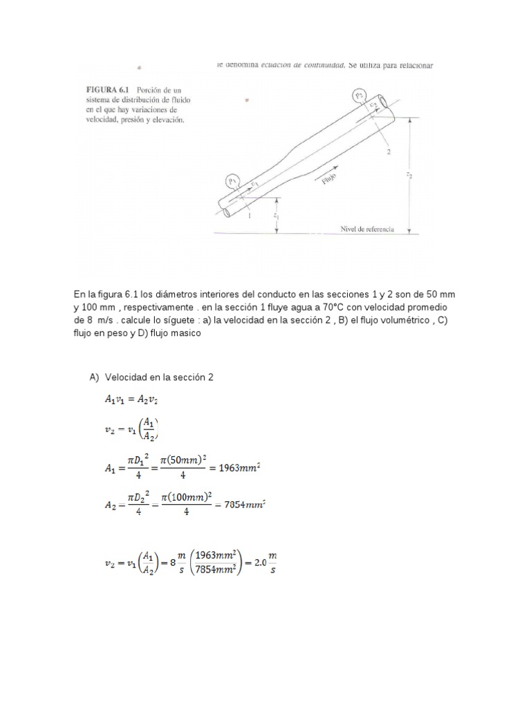 en la seccin 1 fluye agua a 70 con velocidad promedio de ! m"s . calcule lo s#guete $ a% la velocidad en la seccin 2 , &% el flu'o volum(trico , % flu'o en peso y )% flu'o masico