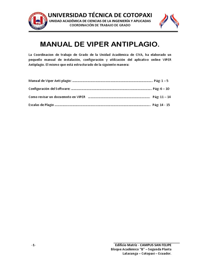La Coordinacion de trabajo de Grado de la Unidad Acadmica de CIYA, ha elaborado un pequeo manual de instalacin, configuracin y utilizacin del aplicativo online VIPER Antiplagio. El mismo que est estructurado de la siguiente manera: