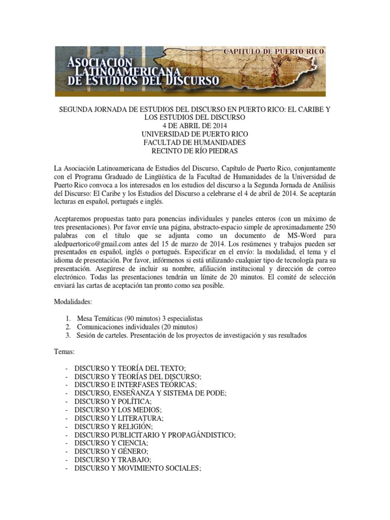 DE PUERTO RICO FACULTAD DE HUMANIDADES RECINTO DE RO PIEDRAS La Asociacin Latinoamericana de Estudios del Discurso, Captulo de Puerto Rico, conjuntamente con el Programa Graduado de Lingstica de la Facultad de Humanidades de la Universidad de Puerto Rico convoca a los interesados en los estudios del discurso a la Segunda Jornada de Anlisis del Discurso: El Caribe y los Estudios del Discurso a celebrarse el 4 de abril de 2014. Se aceptarn lecturas en espaol, portugus e ingls. Aceptaremos propuestas tanto para ponencias individuales y paneles enteros (con un mximo de tres presentaciones). Por favor enve una pgina, abstracto-espacio simple de aproximadamente 250 palabras con el ttulo que se adjunta como un documento de MS-Word para aledpuertorico@[Link] antes del 15 de marzo de 2014. Los resmenes y trabajos pueden ser presentados en espaol, ingls o portugus. Especificar en el envo: la modalidad, el tema y el idioma de presentacin. Por favor, infrmenos si est utilizando cualquier tipo de tecnologa para su presentacin. Asegrese de incluir su nombre, afiliacin institucional y direccin de correo electrnico. Todas las presentaciones tendrn un lmite de 20 minutos. El comit de seleccin enviar las cartas de aceptacin tan pronto como sea posible. Modalidades: 1. Mesa Temticas (90 minutos) 3 especialistas 2. Comunicaciones individuales (20 minutos) 3. Sesin de carteles. Presentacin de los proyectos de investigacin y sus resultados Temas: DISCURSO Y TEORA DEL TEXTO; DISCURSO Y TEORAS DEL DISCURSO; DISCURSO E INTERFASES TERICAS; DISCURSO, ENSEANZA Y SISTEMA DE PODE; DISCURSO Y POLTICA; DISCURSO Y LOS MEDIOS; DISCURSO Y LITERATURA; DISCURSO Y RELIGIN; DISCURSO PUBLICITARIO Y PROPAGNDISTICO; DISCURSO Y CIENCIA; DISCURSO Y GNERO; DISCURSO Y TRABAJO; DISCURSO Y MOVIMIENTO SOCIALES;