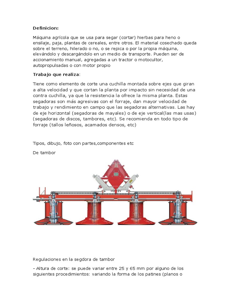 entre otros. El material cosechado queda sobre el terreno, hilerado o no, o se repica o por la propia mquina, elevndolo y descargndolo en un medio de transporte. Pueden ser de accionamiento manual, agregadas a un tractor o motocultor, autopropulsadas o con motor propio Trabajo que realiza !iene como elemento de corte una cuchilla montada sobre ejes que giran a alta velocidad y que cortan la planta por impacto sin necesidad de una contra cuchilla, ya que la resistencia la o"rece la misma planta. Estas segadoras son ms agresivas con el "orraje, dan mayor velocidad de trabajo y rendimiento en campo que las segadoras alternativas. #as hay de eje hori$ontal (segadoras de mayales) o de eje vertical(las mas usas) (segadoras de discos, tambores, etc). %e recomienda en todo tipo de "orraje (tallos le&osos, acamados densos, etc)