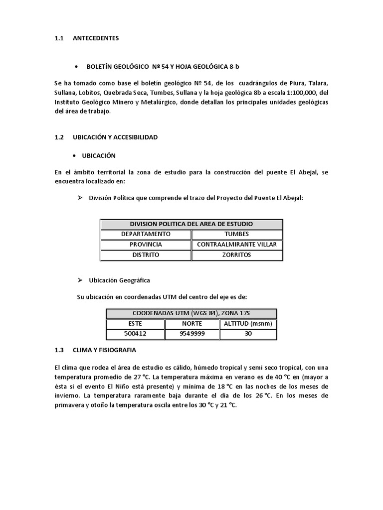 El rea del proyecto Construccin del Puente El Abejal est ubicado en una zona Noroeste de Per, y al Suroeste del Departamento de Tumbes (zona costera), estando limitada al Oeste del Ocano Pacfico y al Este por los flancos de la cordillera Noroccidental Andina. Litolgicamente la zona del proyecto est conformada por rocas del terciario, rocas sedimentarias, secuencias de areniscas, conglomerados y lutitas marrones. Los depsitos cuaternarios inconsolidados de cobertura reciente conformados por sedimentos aluviales. 1.1 GEOMORFOLOGIA