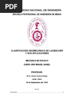 La caracterizacin del macizo rocoso se realiz siguiendo la metodologa de Bieniawski (R.M.R.) rock mass rating, para ello se valora una serie de parmetros: a. Resistencia del material intacto valor mximo = 15 (Ensayo carga puntual o compresin simple) b. R.Q.D. valor mximo = 20