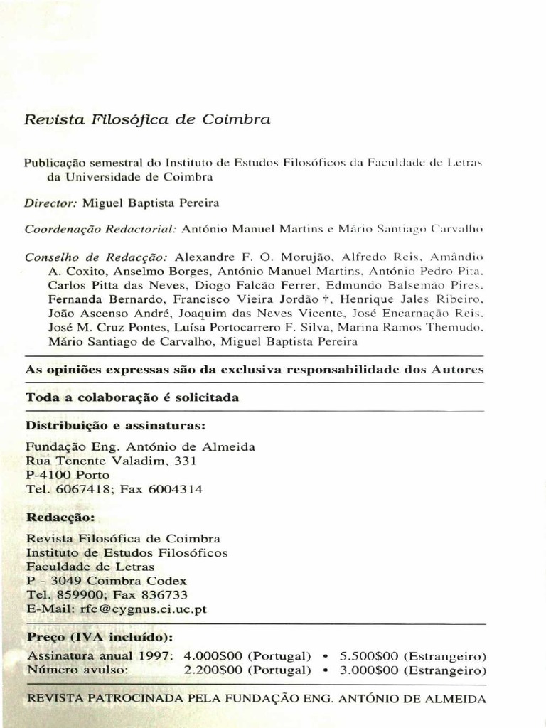 As opinies expressas so da exclusiva responsabilidade dos Autores Toda a colaborao solicitada Distribuio e assinaturas: Fundao Eng. Antnio de Almeida Rua Tenente Valadim, 331 P-4100 Porto Tel. 6067418; Fax 6004314 Redaco: Revista Filosfica de Coimbra Instituto de Estudos Filosficos Faculdade de Letras P - 3049 Coimbra Codex Tel. 859900; Fax 836733 E-Mail: rfc@cygnus.ci.uc.pt Preo ( IVA includo): Assinatura anual 1997: 4.000$00 (Portugal) Nmero avulso: 2.200$00 (Portugal) 5.500$00 (Estrangeiro) 3.000$00 (Estrangeiro)