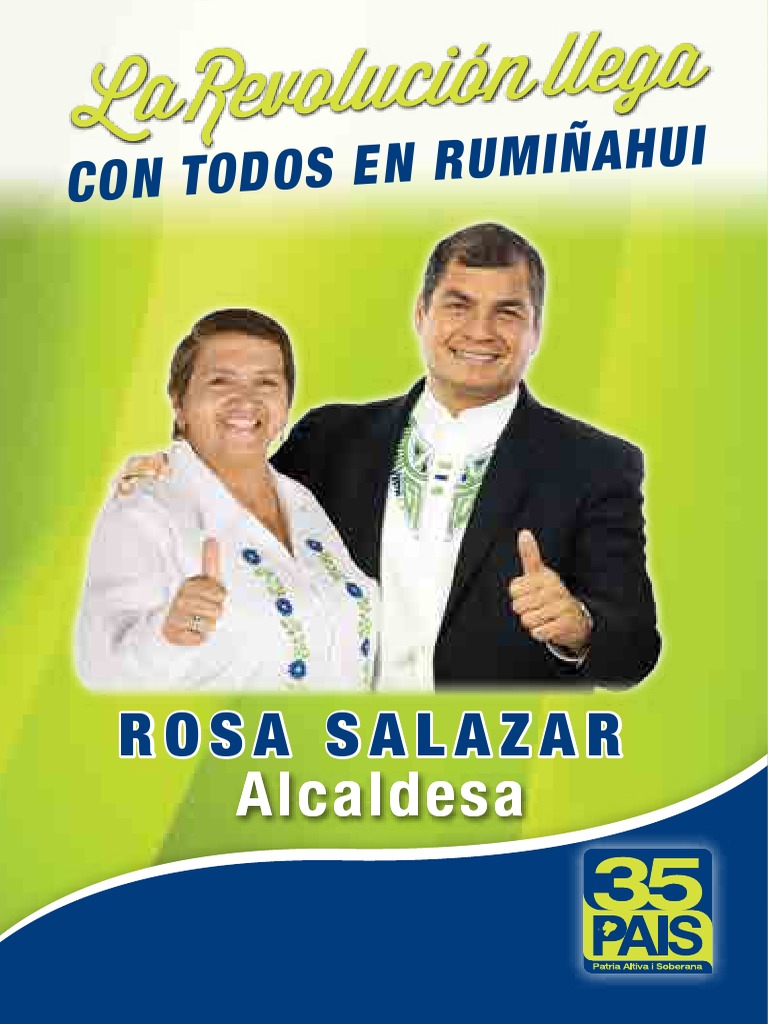 Somos el Movimiento de la Revolucin Ciudadana, el cambio y la transformacin. Asumimos el programa revolucionario del Movimiento Alianza PAIS, liderado por el compaero Rafael Correa; creemos en la independencia de funciones pero tambin en la corresponsabilidad poltica de los gobiernos seccionales y el destino del Ecuador; por ello, presentamos de manera colectiva a la ciudadana de Rumiahui las propuestas fundamentales de nuestro futuro servicio en la administracin del cantn Rumiahui.