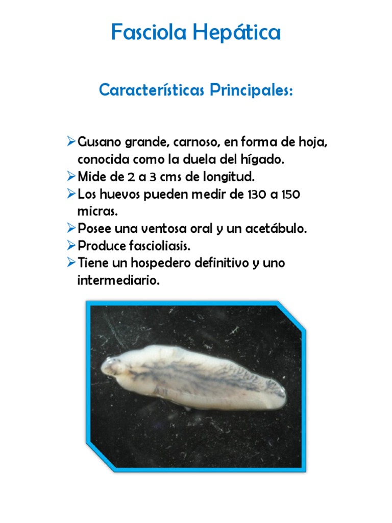 Gusano grande, carnoso, en forma de hoja, conocida como la duela del hgado. Mide de 2 a 3 cms de longitud. Los huevos pueden medir de 130 a 150 micras. Posee una ventosa oral y un acetbulo. Produce fascioliasis. Tiene un hospedero definitivo y uno intermediario.