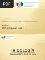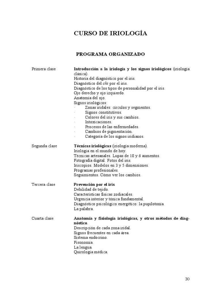Primera clase Introduccin a la iriologa y lo igno iriolgico (iriologa clsica). Historia del diagnstico por el iris. Diagnstico del chi por el iris. Diagnstico de los tipos de personalidad por el iris. Ojo derecho y ojo izquierdo. natoma del ojo. !ignos iriolgicos" # $onas iridales" crculos y segmentos. # !ignos constituti%os. # &olores del iris y sus cam'ios. # (nto)icaciones. # Procesos de las en*ermedades. # &am'ios de pigmentacin. # &ategora de los signos iridianos. !"cnica iriolgica (iriologa moderna). (riologa en el mundo de hoy. +,cnicas artesanales. -upas de ./ y 0 aumentos. 1otogra*a digital. 1otos del iris. (riscopios. 2odelos en 3 y 4 dimensiones. Programas pro*esionales. !eguimientos. &mo %er los cam'ios. Pr#$#ncin %or #l iri . De'ilidad de tejido. &aractersticas *sicas zodiacales. 5rgencia interior y tnica *undamental. Diagnstico psicolgico energ,tico" la pupilotona. -a pala'ra. Anato&a y 'i iologa iriolgica ( y otro &"todo d# diag) n tico. Descripcin de cada zona iridal. !ignos *recuentes en cada rea. !istema endocrino. 1isonoma. -a lengua. 6uirologa m,dica.