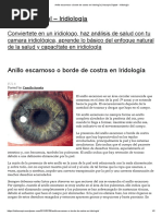 Interpretacin Localizacin en el iris Falta de minerales y tendencia Frente, mandbulas, estmago, a las inflamaciones. intestinos, huesos y ms particularmente columna vertebral. Puntos amarillos. Presencia de quinina (pequea Orejas . cantidad). Puntos mohosos o amarillo- Presencia de quinina (fuerte verdosos. cantidad). Cerebro y rente. Puntos de color amarillo-a!u re. Puntos dorados. Presencia de azufre. Piel y mucosas . "ntestinos . &gado, vescula biliar y cora!n. 'escula biliar, estmago intestinos. (lndulas tiroides y piel. e Residuos qumicos de preparaciones la antes. #anchas oscuras $el color del iris !onsumo regular de productos aparece en transparencia%. que contienen cafena. Puntos verdes. "endencia a los pro#lemas de $escula #iliar. Puntos mohosos anaranjados. Presencia de alcaloides% residuos de medicamentos que contienen yodo.