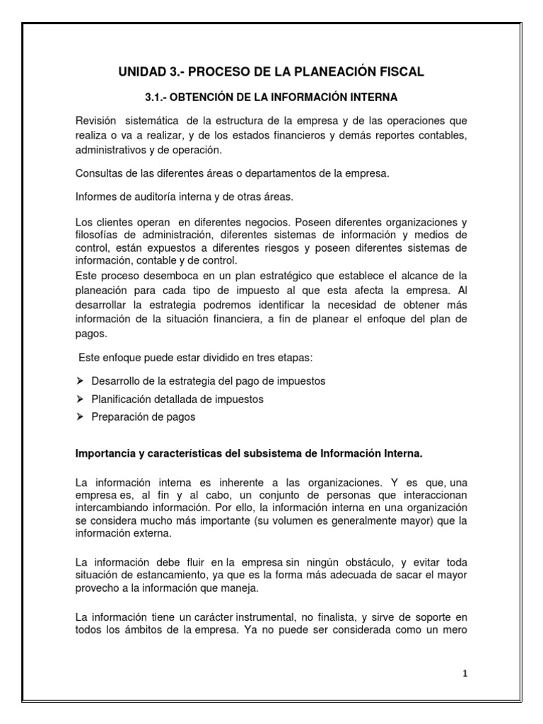3.1.- OBTENCIN DE LA INFORMACIN INTERNA Revisin sistemtica de la estructura de la empresa y de las operaciones que realiza o va a realizar, y de los estados financieros y dems reportes contables, administrativos y de operacin. Consultas de las diferentes reas o departamentos de la empresa. Informes de auditora interna y de otras reas. Los clientes operan en diferentes negocios. Poseen diferentes organizaciones y filosofas de administracin, diferentes sistemas de informacin y medios de control, estn expuestos a diferentes riesgos y poseen diferentes sistemas de informacin, contable y de control. Este proceso desemboca en un plan estratgico que establece el alcance de la planeacin para cada tipo de impuesto al que esta afecta la empresa. Al desarrollar la estrategia podremos identificar la necesidad de obtener ms informacin de la situacin financiera, a fin de planear el enfoque del plan de pagos. Este enfoque puede estar dividido en tres etapas: Desarrollo de la estrategia del pago de impuestos Planificacin detallada de impuestos Preparacin de pagos Importancia y caractersticas del subsistema de Informacin Interna. La informacin interna es inherente a las organizaciones. Y es que, una empresa es, al fin y al cabo, un conjunto de personas que interaccionan intercambiando informacin. Por ello, la informacin interna en una organizacin se considera mucho ms importante (su volumen es generalmente mayor) que la informacin externa. La informacin debe fluir en la empresa sin ningn obstculo, y evitar toda situacin de estancamiento, ya que es la forma ms adecuada de sacar el mayor provecho a la informacin que maneja. La informacin tiene un carcter instrumental, no finalista, y sirve de soporte en todos los mbitos de la empresa. Ya no puede ser considerada como un mero