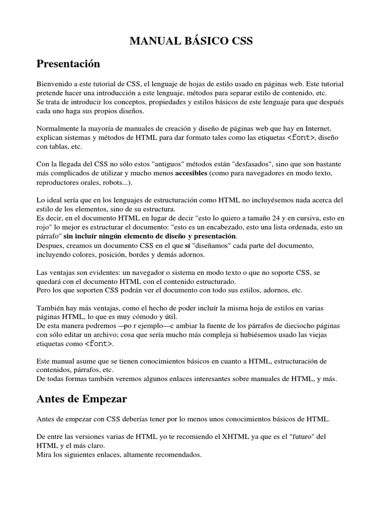 Bienvenido a este tutorial de CSS, el lenguaje de hojas de estilo usado en pginas web. Este tutorial pretende hacer una introduccin a este lenguaje, mtodos para separar estilo de contenido, etc. Se trata de introducir los conceptos, propiedades y estilos bsicos de este lenguaje para que despus cada uno haga sus propios diseos. Normalmente la mayora de manuales de creacin y diseo de pginas web que hay en Internet, explican sistemas y mtodos de HTML para dar formato tales como las etiquetas <font>, diseo con tablas, etc. Con la llegada del CSS no slo estos "antiguos" mtodos estn "desfasados", sino que son bastante ms complicados de utilizar y mucho menos accesibles (como para navegadores en modo texto, reproductores orales, robots...). Lo ideal sera que en los lenguajes de estructuracin como HTML no incluysemos nada acerca del estilo de los elementos, sino de su estructura. Es decir, en el documento HTML en lugar de decir "esto lo quiero a tamao 24 y en cursiva, esto en rojo" lo mejor es estructurar el documento: "esto es un encabezado, esto una lista ordenada, esto un prrafo" sin inclur ningn elemento de diseo y presentacin. Despues, creamos un documento CSS en el que s "diseamos" cada parte del documento, incluyendo colores, posicin, bordes y dems adornos. Las ventajas son evidentes: un navegador o sistema en modo texto o que no soporte CSS, se quedar con el documento HTML con el contenido estructurado. Pero los que soporten CSS podrn ver el documento con todo sus estilos, adornos, etc. Tambin hay ms ventajas, como el hecho de poder inclur la misma hoja de estilos en varias pginas HTML, lo que es muy cmodo y til. De esta manera podremos po r ejemplo c ambiar la fuente de los prrafos de dieciocho pginas con slo editar un archivo; cosa que sera mucho ms compleja si hubisemos usado las viejas etiquetas como <font>. Este manual asume que se tienen conocimientos bsicos en cuanto a HTML, estructuracin de contenidos, prrafos, etc. De todas formas tambin veremos algunos enlaces interesantes sobre manuales de HTML, y ms.