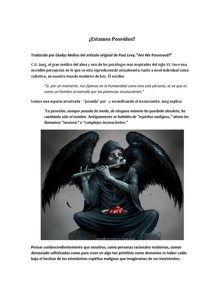Traducido por Gladys Molina del artculo original de Paul Levy; "Are We Possessed?" C.G. Jung, el gran mdico del alma y uno de los psiclogos ms inspirados del siglo XX, tuvo una increble percepcin en lo que se est reproduciendo actualmente, tanto a nivel individual como colectivo, en nuestro mundo moderno de hoy. l escribe: "Si, por un momento, nos fijamos en la humanidad como una sola persona, se ve que es como un hombre arrastrado por las potencias inconscientes." Somos una especie arrastrada - "poseda" por - y escenificando el inconsciente. Jung explica: "La posesin, aunque pasada de moda, de ninguna manera ha quedado obsoleta, ha cambiado slo el nombre. Antiguamente se hablaba de "espritus malignos," ahora los llamamos "neurosis" o "complejos inconscientes."