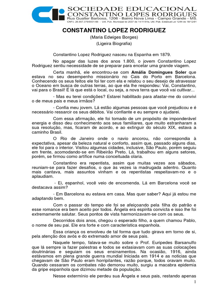 seu filho Pablo, que ainda estava fraquinho e com o passar do tempo, sem estar completamente restabelecido, no suportou a 2 epidemia, a Varola e abandonou o corpo. Bem que antes disso o nosso Constantino quis lev-lo para receber um Passe do Prof. Euripedes Barsanulfo, porm, foi informado de que tambm Barsanulfo havia falecido com a gripe espanhola. Sob o efeito da dor e da saudade, to logo terminou o inventrio da ngela e de seus pais, Constantino achou por bem vender as propriedades, sair de Ribeiro Preto, e seguir para o Sul de Mato Grosso (naquela poca o estado no havia sido dividido). A sua chegada em Campo Grande, foi no dia 03 de maio de 1920. Numa grande composio o Trem de Ferro apitando, foi diminuindo a marcha at encostar-se estao de Campo Grande, onde tinha muita gente se movimentando. Eram 17h00min... l? - Constantino, eu sempre me hospedo na Penso Bentinho, vamos pra - Vamos, onde fica? - Na Rua Baro de Melgao, uma das mais antigas da cidade. - Ento vamos. Chegando l ele olhou o casaro antigo, mas muito confortvel, com muito asseio e muitas flores. Comeou a trovejar, e eles compreenderam que no daria para sair noite. - Melhor assim; dormiremos mais cedo, disse Ramo sorrindo. Enquanto conversavam Constantino foi deitar numa rede armada na varanda entrou D. lzaura, proprietria da Penso. demorar. - Hoje no d para vocs irem ao cinema, porque a chuva no vai - D. Izaura, a senhora conhece algum espanhol em Campo Grande? - Conheo. Aqui tem at o Clube Espanhol. - ? Que bom. Aquela foi mesmo uma noite de descanso. O dia seguinte amanheceu lindo. Logo cedo, saram para andar e a cidade parecia sorrir. O amigo foi para um lado e ele para outro. - Olha, aqui penso Bentinho! - Est bem, no vou esquecer. Constantino continuou andando, olhou o relgio e j eram 09h00min, ento perguntou a uma criana que passava: Aqui tem cinema? O menino afirmou s com a cabea; tem Banco? Sim, com a cabea. Tem restaurante? O menino confirmou. Ele agradeceu! Quando o menino j ia longe, ele encaminhou-se para o Banco, conversou com o Gerente e a ele entregou uma Ordem de Pagamento. O Gerente foi muito solicito e trouxe os papis para serem preenchidos a fim de abrir uma conta bancaria em seu nome. Ningum ficou sabendo sobre o ocorrido e ele s carregava consigo a importncia necessria. D. Izaura falou com a vizinha sobre o seu hospede e ela ia saber como chegar at o espanhol. Naquele mesmo dia a vizinha voltou com a pista. E que na