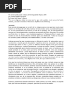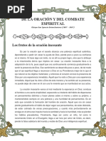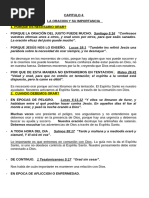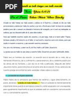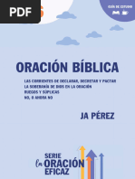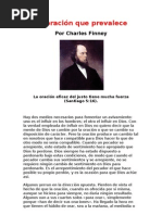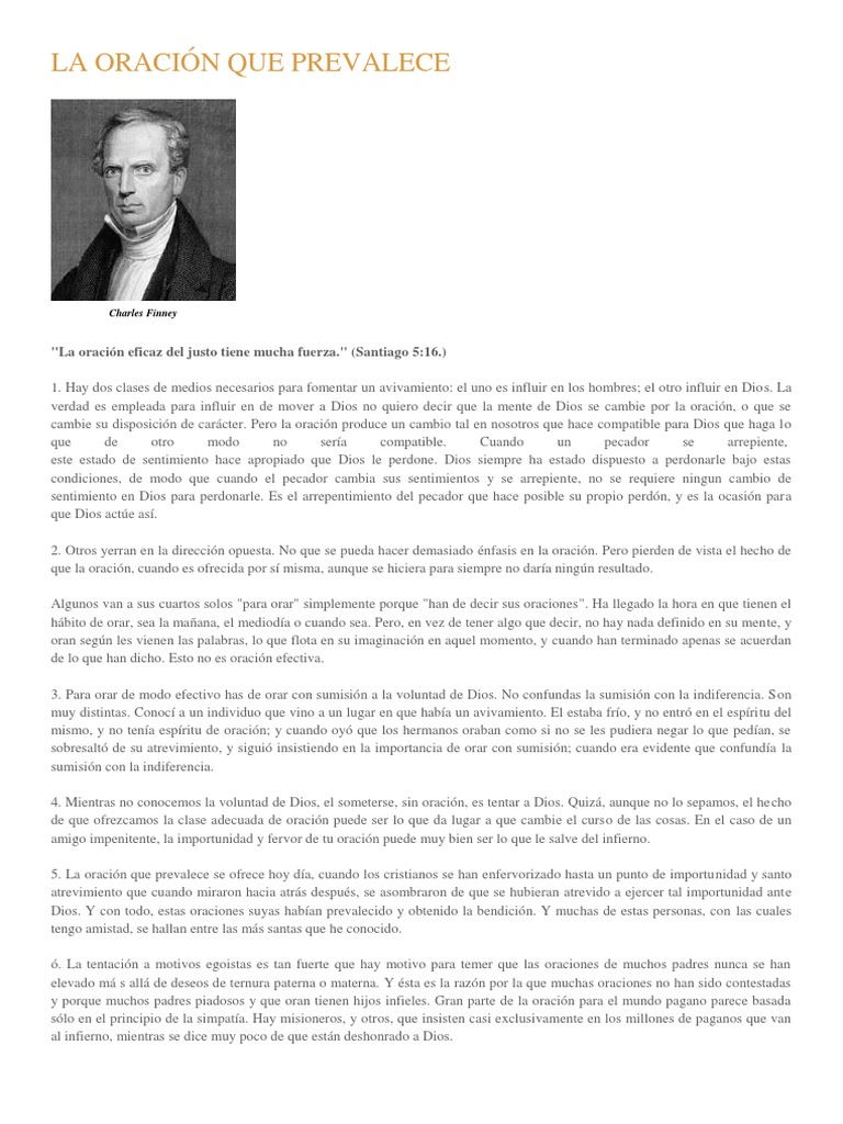 "La oracin eficaz del justo tiene mucha fuerza." (Santiago 5:16.) 1. Hay dos clases de medios necesarios para fomentar un avivamiento: el uno es influir en los hombres; el otro influir en Dios. La verdad es empleada para influir en de mover a Dios no quiero decir que la mente de Dios se cambie por la oracin, o que se cambie su disposicin de carcter. Pero la oracin produce un cambio tal en nosotros que hace compatible para Dios que haga lo que de otro modo no sera compatible. Cuando un pecador se arrepiente, este estado de sentimiento hace apropiado que Dios le perdone. Dios siempre ha estado dispuesto a perdonarle bajo estas condiciones, de modo que cuando el pecador cambia sus sentimientos y se arrepiente, no se requiere ningun cambio de sentimiento en Dios para perdonarle. Es el arrepentimiento del pecador que hace posible su propio perdn, y es la ocasin para que Dios acte as. 2. Otros yerran en la direccin opuesta. No que se pueda hacer demasiado nfasis en la oracin. Pero pierden de vista el hecho de que la oracin, cuando es ofrecida por s misma, aunque se hiciera para siempre no dara ningn resultado. Algunos van a sus cuartos solos "para orar" simplemente porque "han de decir sus oraciones". Ha llegado la hora en que tienen el hbito de orar, sea la maana, el medioda o cuando sea. Pero, en vez de tener algo que decir, no hay nada definido en su mente, y oran segn les vienen las palabras, lo que flota en su imaginacin en aquel momento, y cuando han terminado apenas se acuerdan de lo que han dicho. Esto no es oracin efectiva. 3. Para orar de modo efectivo has de orar con sumisin a la voluntad de Dios. No confundas la sumisin con la indiferencia. Son muy distintas. Conoc a un individuo que vino a un lugar en que haba un avivamiento. El estaba fro, y no entr en el espritu del mismo, y no tena espritu de oracin; y cuando oy que los hermanos oraban como si no se les pudiera negar lo que pedan, se sobresalt de su atrevimiento, y sigui insistiendo en la importancia de orar con sumisin; cuando era evidente que confunda la sumisin con la indiferencia. 4. Mientras no conocemos la voluntad de Dios, el someterse, sin oracin, es tentar a Dios. Quiz, aunque no lo sepamos, el hecho de que ofrezcamos la clase adecuada de oracin puede ser lo que da lugar a que cambie el curso de las cosas. En el caso de un amigo impenitente, la importunidad y fervor de tu oracin puede muy bien ser lo que le salve del infierno. 5. La oracin que prevalece se ofrece hoy da, cuando los cristianos se han enfervorizado hasta un punto de importunidad y santo atrevimiento que cuando miraron hacia atrs despus, se asombraron de que se hubieran atrevido a ejercer tal importunidad ante Dios. Y con todo, estas oraciones suyas haban prevalecido y obtenido la bendicin. Y muchas de estas personas, con las cuales tengo amistad, se hallan entre las ms santas que he conocido. . La tentacin a motivos egoistas es tan fuerte que hay motivo para temer que las oraciones de muchos padres nunca se han elevado m s all de deseos de ternura paterna o materna. Y sta es la razn por la que muchas oraciones no han sido contestadas y porque muchos padres piadosos y que oran tienen hijos infieles. Gran parte de la oracin para el mundo pagano parece basada slo en el principio de la simpata. Hay misioneros, y otros, que insisten casi exclusivamente en los millones de paganos que van al infierno, mientras se dice muy poco de que estn deshonrado a Dios.