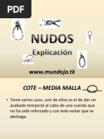 Conocido tambin como el nudo del pulgar, es el nudo popular por excelencia y es uno de los nudos ms sencillos y conocidos que existen, por lo que se le llama "medio nudo". Se usa como nudo de tope y se ejecuta a intervalos regulares en cuerdas de rescate. Su aplicacin ms comn es la de mantener el cabo cuando ste se pasa a travs del ojo de una aguja. No es, sin embargo, demasiado popular entre los marineros, ya que resulta difcil de deshacer cuando est mojado. De igual forma, un medio nudo en cabos de pequeo dimetro es muy difcil de deshacer. Elaboracin: Con el chicote o extremidad libre del cabo se forma un seno o curvatura del cabo, pasndolo sobre el firme, que es la extremidad del cabo que no est libre. Se introduce luego el chicote dentro del seno formado, por debajo del firme. Una vez acabado el nudo, se azoca tirando del chicote en sentido opuesto al firme.