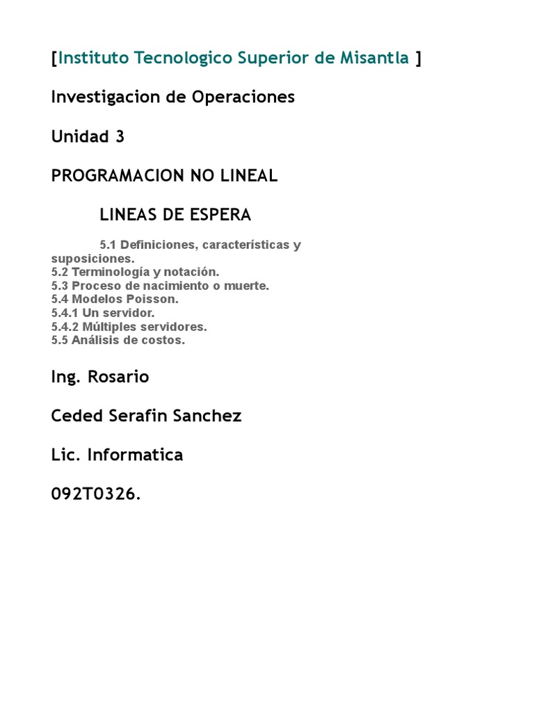 5.1 Definiciones %neas de &spera caractersticas y suposiciones P'()&*( +,*-)( D& %#* %./&#* D& &*P&'#. Una situacin de lnea de espera, se genera de la siguiente manera: El cliente llega a una instalacin se forma en un lnea de espera. El servidor elige a un cliente de la lnea de espera, para comenzar el servicio. Al trmino del servicio se repite el proceso de elegir un nuevo cliente. )liente.0 Unidades que entran al sistema para recibir un servicio. Pueden ser personas, cartas, carros, incendios, ensambles intermedios en una f brica, etc. *er!idor.0 Unidades encargadas de prestar un servicio. Pueden ser las ca!as en un banco, en un supermercado, unidades de emergencias, un mdico, una maquina, etc. Disciplina de ser!icio.0 "egla establecida para proporcionar un servicio a un cliente en la lnea de espera.
