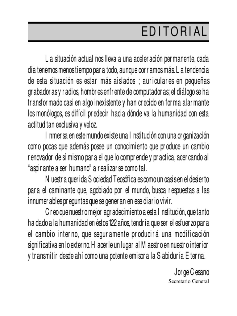 La situacin actual nos lleva a una aceleracin permanente, cada da tenemos menos tiempo para todo, aunque corramos ms. La tendencia de esta situacin es estar ms aislados ; auriculares en pequeas grabadoras y radios, hombres enfrente de computadoras; el dilogo se ha transformado casi en algo inexistente y han crecido en forma alarmante los monlogos, es difcil predecir hacia dnde va la humanidad con esta actitud tan exclusiva y veloz. Inmersa en este mundo existe una Institucin con una organizacin como pocas que adems posee un conocimiento que produce un cambio renovador de s mismo para el que lo comprende y practica, acercando al aspirante a ser humano a realizarse como tal. Nuestra querida Sociedad Teosfica es como un oasis en el desierto para el caminante que, agobiado por el mundo, busca respuestas a las innumerables preguntas que se generan en ese diario vivir. Creo que nuestro mejor agradecimiento a esta Institucin, que tanto ha dado a la humanidad en stos 122 aos, tendra que ser el esfuerzo para el cambio interno, que seguramente producir una modificacin significativa en lo externo. Hacerle un lugar al Maestro en nuestro interior y transmitir desde ah como una potente emisora la Sabidura Eterna. Jorge Cesano