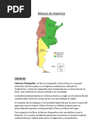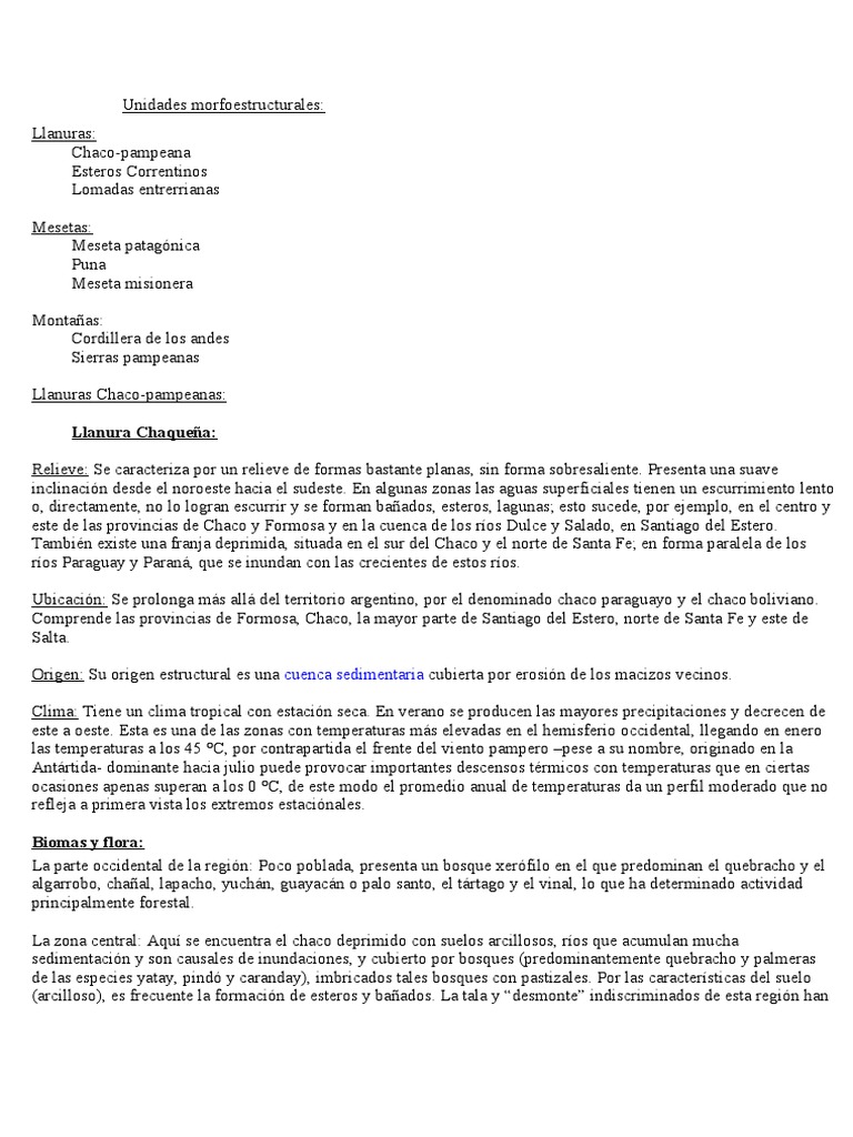 Cordillera de los andes Sierras pampeanas Llanuras Chaco-pampeanas: Llanura Chaquea: Relieve: Se caracteri a por un relieve de formas !astante planas" sin forma so!resaliente# Presenta una suave inclinacin desde el noroeste hacia el sudeste# En algunas onas las aguas superficiales tienen un escurrimiento lento o" directamente" no lo logran escurrir $ se forman !aados" esteros" lagunas% esto sucede" por e&emplo" en el centro $ este de las provincias de Chaco $ 'ormosa $ en la cuenca de los r(os )ulce $ Salado" en Santiago del Estero# *am!i+n e,iste una fran&a deprimida" situada en el sur del Chaco $ el norte de Santa 'e% en forma paralela de los r(os Paragua$ $ Paran-" .ue se inundan con las crecientes de estos r(os# U!icacin: Se prolonga m-s all- del territorio argentino" por el denominado chaco paragua$o $ el chaco !oliviano# Comprende las provincias de 'ormosa" Chaco" la ma$or parte de Santiago del Estero" norte de Santa 'e $ este de Salta# /rigen: Su origen estructural es una cuenca sedimentaria cu!ierta por erosin de los maci os vecinos# Clima: *iene un clima tropical con estacin seca# En verano se producen las ma$ores precipitaciones $ decrecen de este a oeste# Esta es una de las onas con temperaturas m-s elevadas en el hemisferio occidental" llegando en enero las temperaturas a los 01 2C" por contrapartida el frente del viento pampero 3pese a su nom!re" originado en la 4nt-rtida- dominante hacia &ulio puede provocar importantes descensos t+rmicos con temperaturas .ue en ciertas ocasiones apenas superan a los 5 2C" de este modo el promedio anual de temperaturas da un perfil moderado .ue no refle&a a primera vista los e,tremos estacinales# Biomas y flora: La parte occidental de la regin: Poco po!lada" presenta un ![Link] ,erfilo en el .ue predominan el .ue!racho $ el algarro!o" chaal" lapacho" $uch-n" gua$ac-n o palo santo" el t-rtago $ el vinal" lo .ue ha determinado actividad principalmente forestal# La ona central: 4.u( se encuentra el chaco deprimido con suelos arcillosos" r(os .ue acumulan mucha sedimentacin $ son causales de inundaciones" $ cu!ierto por ![Link] 6predominantemente .ue!racho $ palmeras de las especies $ata$" pind $ caranda$7" im!ricados tales ![Link] con pasti ales# Por las caracter(sticas del suelo 6arcilloso7" es frecuente la formacin de esteros $ !aados# La tala $ 8desmonte9 indiscriminados de esta regin han