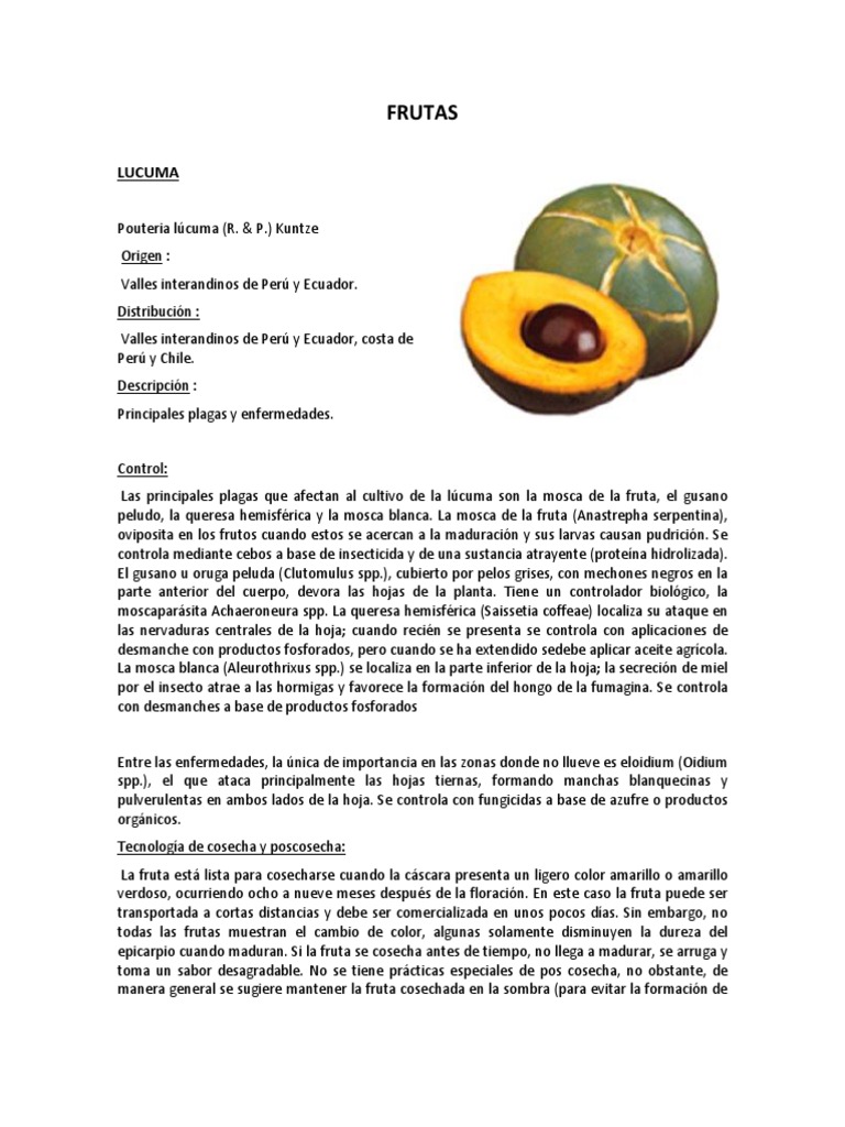 Pouteria lcuma (R. & P.) Kuntze Origen : Valles interandinos de Per y Ecuador. Distribucin : Valles interandinos de Per y Ecuador, costa de Per y Chile. Descripcin : Principales plagas y enfermedades.