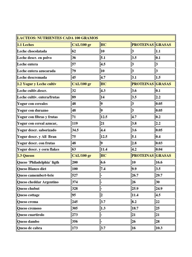 LACTEOS: NUTRIENTES CADA 100 GRAMOS 1.1 Leches Leche chocolatada Leche descr. en polvo Leche entera Leche entera azucarada Leche descremada 1.2 Yogur y Leche cultiv Leche [Link]. Leche cultiv. entera/frutas Yogur con cereales Yogur con durazno Yogur con fibras y frutas Yogur con cereal azucar, Yogur descr. saborizado Yogur descr. y All Bran Yogur descr. con frutas Yogur descr. y corn flakes 1.3 Quesos Queso Philadelphia ligth Queso Blanco diet Queso camembert-brie Queso cheddar Argentino Queso chubut Queso cottage Queso crema Queso cremoso Queso cuartirolo Queso dambo Queso de cabra CAL/100 gr 62 36 57 79 45 CAL/100 gr 32 89 48 48 71 119 34.5 75 48 63 CAL/100 gr 200 100 527 374 328 95 245 305 273 356 173 HC 10 5.1 4.5 10 4.7 HC 4.3 14 9 9 12.5 21 4.4 12.5 9 11.4 HC 6.6 7.4 2 3.7 1.3 3.7 PROTEINAS GRASAS 3 3.5 3 3 3.1 3.6 3.5 3 3 4.7 3.8 3.6 5.1 2.8 4.2 10 9.9 26.7 26 25.9 11.4 8.2 18.7 21 26 16 1.1 0.1 3 3 1.5 0.1 2.2 0.05 0.05 0.2 2.2 0.05 0.4 0.03 0.04 16.6 3.5 29.7 30 24.9 4.5 22 25 21 28 10.3