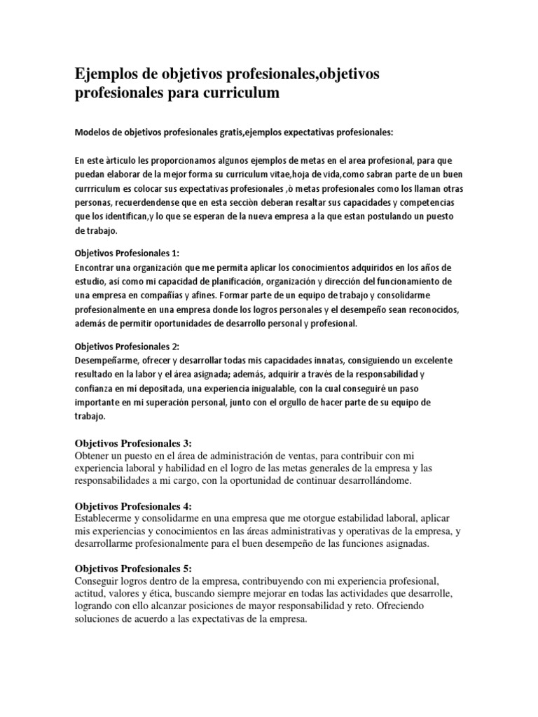 Modelos de objetivos profesionales gratis,ejemplos expectativas profesionales: En este rticulo les proporcionamos algunos ejemplos de metas en el area profesional, para que puedan elaborar de la mejor forma su curriculum vitae,hoja de vida,como sabran parte de un buen currriculum es colocar sus expectativas profesionales , metas profesionales como los llaman otras personas, recuerdendense que en esta seccin deberan resaltar sus capacidades y competencias que los identifican,y lo que se esperan de la nueva empresa a la que estan postulando un puesto de trabajo. Objetivos Profesionales 1: Encontrar una organizacin que me permita aplicar los conocimientos adquiridos en los aos de estudio, as como mi capacidad de planificacin, organizacin y direccin del funcionamiento de una empresa en compaas y afines. Formar parte de un equipo de trabajo y consolidarme profesionalmente en una empresa donde los logros personales y el desempeo sean reconocidos, adems de permitir oportunidades de desarrollo personal y profesional. Objetivos Profesionales 2: Desempearme, ofrecer y desarrollar todas mis capacidades innatas, consiguiendo un excelente resultado en la labor y el rea asignada; adems, adquirir a travs de la responsabilidad y confianza en m depositada, una experiencia inigualable, con la cual conseguir un paso importante en mi superacin personal, junto con el orgullo de hacer parte de su equipo de trabajo.