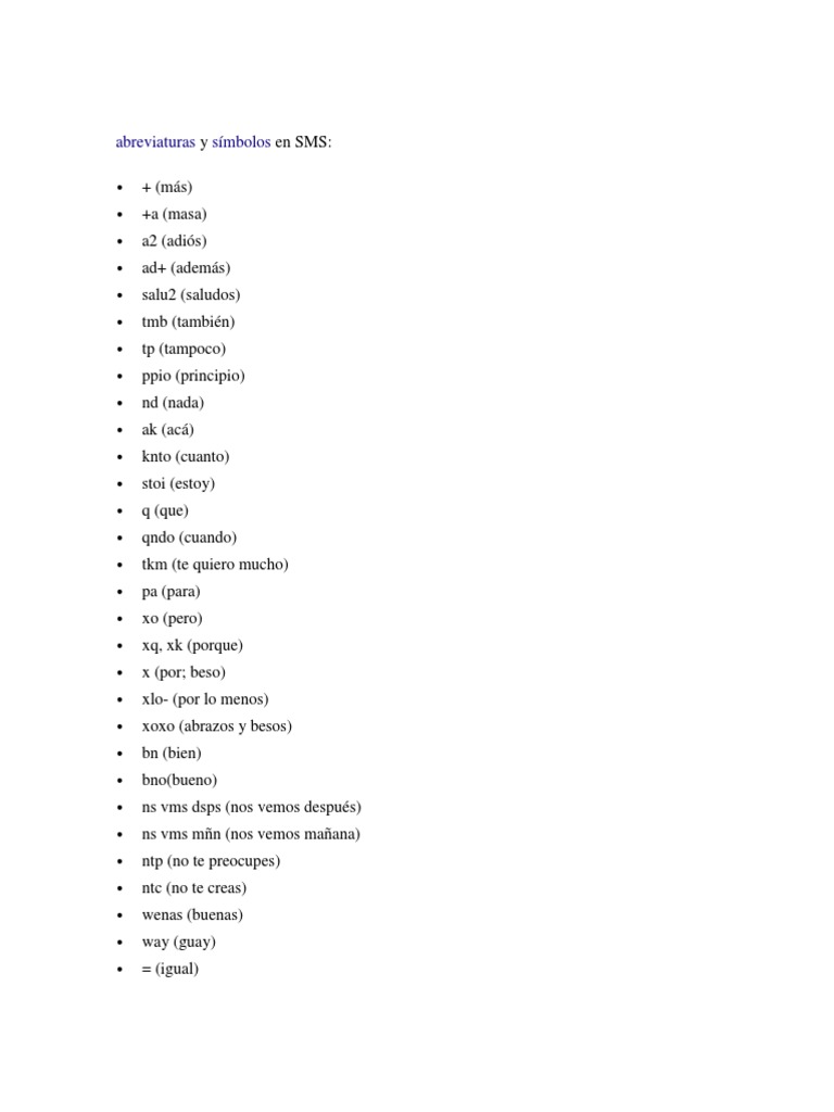 + (ms) +a (masa) a2 (adis) ad+ (adems) salu2 (saludos) tmb (tambin) tp (tampoco) ppio (principio) nd (nada) ak (ac) knto (cuanto) stoi (estoy) q (que) qndo (cuando) tkm (te quiero mucho) pa (para) xo (pero) xq, xk (porque) x (por; beso) xlo- (por lo menos) xoxo (abrazos y besos) bn (bien) bno(bueno) ns vms dsps (nos vemos despus) ns vms mn (nos vemos maana) ntp (no te preocupes) ntc (no te creas) wenas (buenas) way (guay) = (igual)