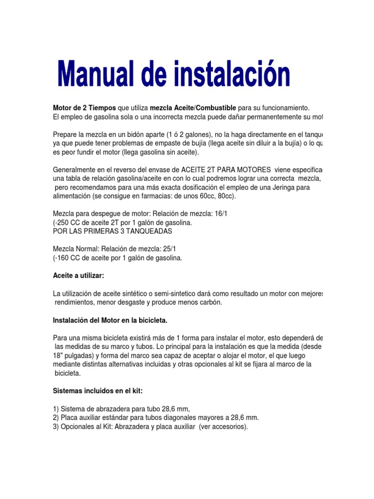 El empleo de gasolina sola o una incorrecta mezcla puede daar permanentemente su motor. Prepare la mezcla en un bidn aparte (1 2 galones), no la haga directamente en el tanque ya que puede tener problemas de empaste de buja (llega aceite sin diluir a la buja) o lo que es peor fundir el motor (llega gasolina sin aceite). Generalmente en el reverso del envase de ACEITE 2T PARA MOTORES viene especificada una tabla de relacin gasolina/aceite en con lo cual podremos lograr una correcta mezcla, pero recomendamos para una ms exacta dosificacin el empleo de una Jeringa para alimentacin (se consigue en farmacias: de unos 60cc, 80cc). Mezcla para despegue de motor: Relacin de mezcla: 16/1 (-250 CC de aceite 2T por 1 galn de gasolina. POR LAS PRIMERAS 3 TANQUEADAS Mezcla Normal: Relacin de mezcla: 25/1 (-160 CC de aceite por 1 galn de gasolina. Aceite a utilizar: La utilizacin de aceite sinttico o semi-sintetico dar como resultado un motor con mejores rendimientos, menor desgaste y produce menos carbn. Instalacin del Motor en la bicicleta. Para una misma bicicleta existir ms de 1 forma para instalar el motor, esto depender de las medidas de su marco y tubos. Lo principal para la instalacin es que la medida (desde 18" pulgadas) y forma del marco sea capaz de aceptar o alojar el motor, el que luego mediante distintas alternativas incluidas y otras opcionales al kit se fijara al marco de la bicicleta. Sistemas incluidos en el kit: 1) Sistema de abrazadera para tubo 28,6 mm, 2) Placa auxiliar estndar para tubos diagonales mayores a 28,6 mm. 3) Opcionales al Kit: Abrazadera y placa auxiliar (ver accesorios).