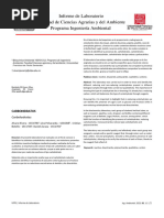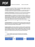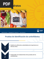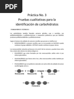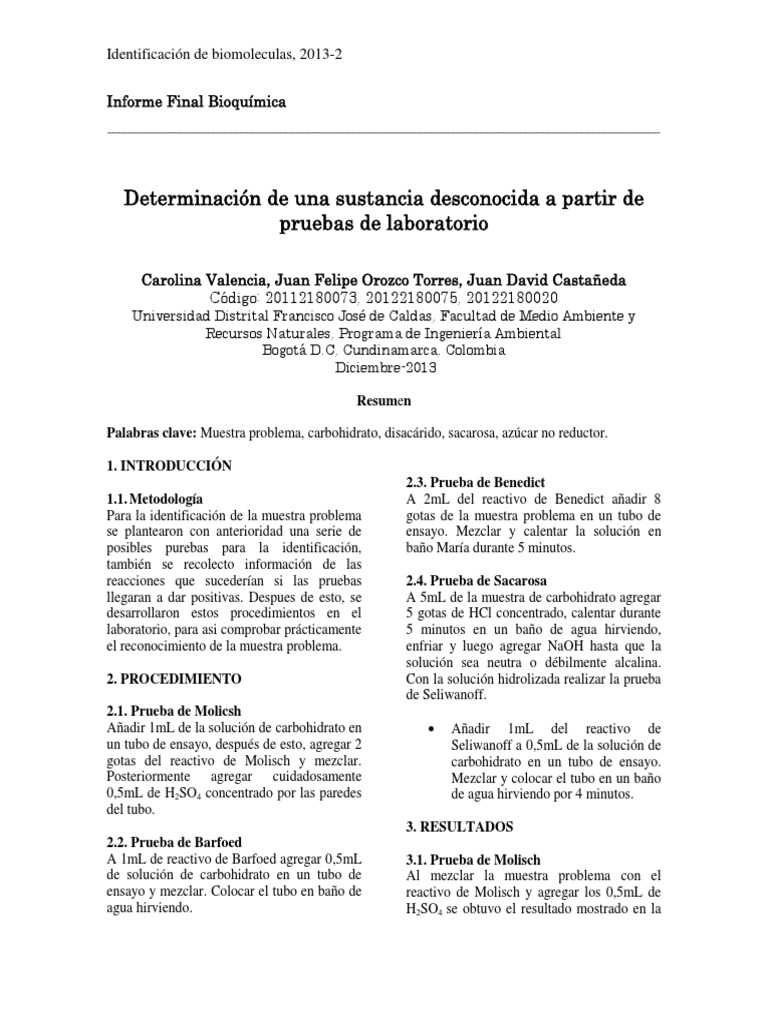 Universidad Distrital Francisco Jos de Caldas, Facultad de Medio Ambiente y Recursos Naturales, Programa de Ingeniera Ambiental Bogot D.C, Cundinamarca, Colombia Diciembre-2013 Resumen Palabras clave: Muestra problema, carbohidrato, disacrido, sacarosa, azcar no reductor. 1. INTRODUCCIN 1.1. Metodologa Para la identificacin de la muestra problema se plantearon con anterioridad una serie de posibles purebas para la identificacin, tambin se recolecto informacin de las reacciones que sucederan si las pruebas llegaran a dar positivas. Despues de esto, se desarrollaron estos procedimientos en el laboratorio, para asi comprobar prcticamente el reconocimiento de la muestra problema. 2. PROCEDIMIENTO 2.1. Prueba de Molicsh Aadir 1mL de la solucin de carbohidrato en un tubo de ensayo, despus de esto, agregar 2 gotas del reactivo de Molisch y mezclar. Posteriormente agregar cuidadosamente 0,5mL de H2SO4 concentrado por las paredes del tubo. 2.2. Prueba de Barfoed A 1mL de reactivo de Barfoed agregar 0,5mL de solucin de carbohidrato en un tubo de ensayo y mezclar. Colocar el tubo en bao de agua hirviendo. 2.3. Prueba de Benedict A 2mL del reactivo de Benedict aadir 8 gotas de la muestra problema en un tubo de ensayo. Mezclar y calentar la solucin en bao Mara durante 5 minutos. 2.4. Prueba de Sacarosa A 5mL de la muestra de carbohidrato agregar 5 gotas de HCl concentrado, calentar durante 5 minutos en un bao de agua hirviendo, enfriar y luego agregar NaOH hasta que la solucin sea neutra o dbilmente alcalina. Con la solucin hidrolizada realizar la prueba de Seliwanoff. Aadir 1mL del reactivo de Seliwanoff a 0,5mL de la solucin de carbohidrato en un tubo de ensayo. Mezclar y colocar el tubo en un bao de agua hirviendo por 4 minutos.