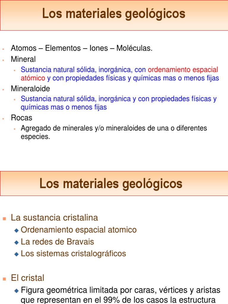 Sustancia natural slida, inorgnica, con ordenamiento espacial atmico y con propiedades fsicas y qumicas mas o menos fijas Sustancia natural slida, inorgnica y con propiedades fsicas y qumicas mas o menos fijas Agregado de minerales y/o mineraloides de una o diferentes especies.