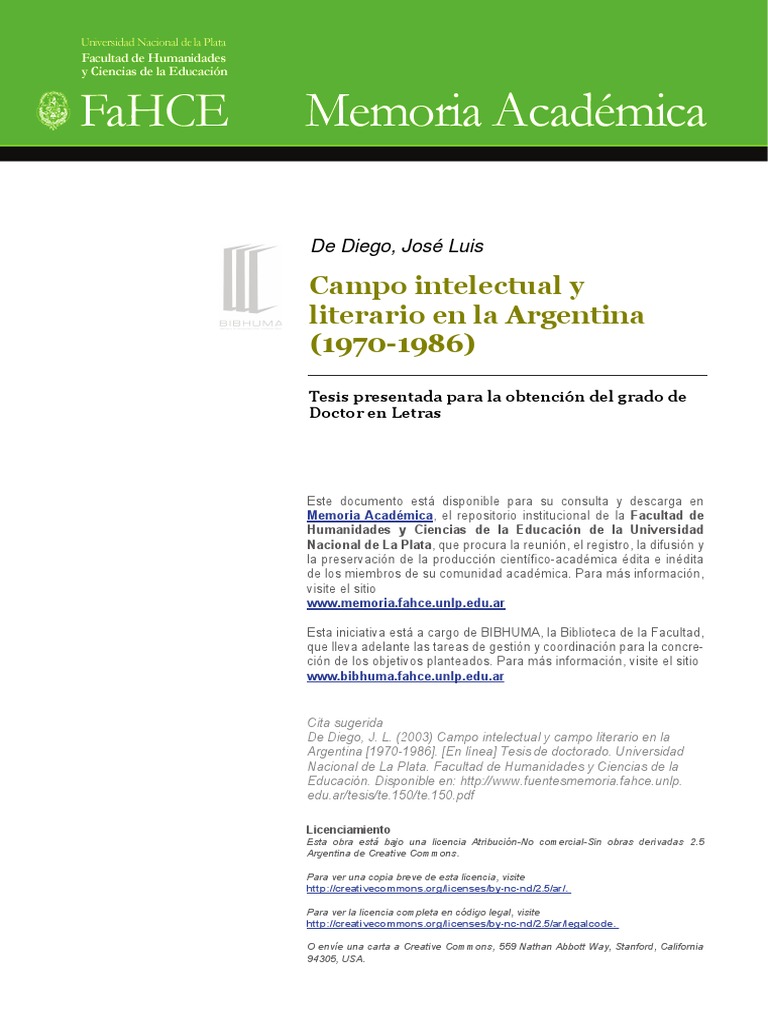 Humanidades y Ciencias de la Educacin de la Universidad Nacional de La Plata, que procura la reunin, el registro, la difusin y la preservacin de la produccin cientfico-acadmica dita e indita de los miembros de su comunidad acadmica. Para ms informacin, visite el sitio www.memoria.fahce.unlp.edu.ar Esta iniciativa est a cargo de BIBHUMA, la Biblioteca de la Facultad, que lleva adelante las tareas de gestin y coordinacin para la concre- cin de los objetivos planteados. Para ms informacin, visite el sitio www.bibhuma.fahce.unlp.edu.ar Licenciamiento Esta obra est bajo una licencia Atribucin-No comercial-Sin obras derivadas 2.5 Argentina de Creative Commons. Para ver una copia breve de esta licencia, visite http://creativecommons.org/licenses/by-nc-nd/2.5/ar/. Para ver la licencia completa en cdigo legal, visite http://creativecommons.org/licenses/by-nc-nd/2.5/ar/legalcode. O enve una carta a Creative Commons, 559 Nathan Abbott Way, Stanford, California 94305, USA. De Diego, Jos Luis Campo intelectual y literario en la Argentina (1970-1986) Tesis presentada para la obtencin del grado de Doctor en Letras Cita sugerida De Diego, J. L. (2003) Campo intelectual y campo literario en la Argentina [1970-1986]. [En lnea] Tesis de doctorado. Universidad Nacional de La Plata. Facultad de Humanidades y Ciencias de la Educacin. Disponible en: http://www.fuentesmemoria.fahce.unlp. edu.ar/tesis/te.150/te.150.pdf Jos Luis de Diego Campo intelectual y campo literario en la Argentina (1970-1986) Tesis doctoral realizada en la Facultad de Humanidades y Ciencias de la Educacin de la Universidad Nacional de La Plata, diciembre de 2000 Indice I -Introduccin II - El campo intelectual (1970-1976) 1. Los debates de Nuevos Aires 1.1. El escritor revolucionario 1.2. Tres soluciones para el dilema intelectual/revolucin 2. El proyecto ideolgico de Crisis 2.1. El peronismo revolucionario y la cuestin poltica 2.2. Intelectual argentino, poeta guerrillero, escritor del pueblo III - El campo literario (1970-1976) 1. Miradas sobre el campo literario latinoamericano 2. Miradas sobre el campo literario argentino 2.1. Los Libros: nueva crtica y nueva literatura 2.1.1. Los axiomas de la nueva crtica 2.1.2. La nueva literatura argentina en Los Libros IV - La dictadura 1. Fundamentos y acciones de la represin cultural 2. La resistencia cultural: el campo literario 2.1. Loslibros 2.2. Losautores 2.3. Lasrevistas 2.3.1. Los editoriales de El Ornitorrinco 2.3.2. La primera etapa de Punto de Vista (1978-1982) V - El exilio 1. Algunos datos 2. Las mltiples tradiciones del exilio 3. Los relatos de la experiencia 4. Exilio: lengua, escritura, literatura 5. Las polmicas VI - La pos-dictadura: el campo intelectual 1. El regreso, el desexilio, las mutaciones polticas 2. Algunos temas en debate durante la pos-dictadura 2.1. De la filosofa de lo concreto a la dimensin utpica 2.2. De la primaca de la poltica a la reivindicacin de la tica 2.3. De la liberacin nacional a la cuestin democrtica 2.4. Las nuevas funciones del intelectual: del compromiso a la responsabilidad VII - La pos-dictadura: el campo literario 1. Experiencia y narracin 2. Narracin y novela 3. Novela y representacin 4. Novela y campo literario Apndice. Aportes para un estudio de la novela (1976-1986). Estado de la cuestin Bibliografa General Agradecimientos I Introduccin El tema del que nos ocupamos plantea numerosos problemas de ndole histrica, terica y metodolgica, de recopilacin y manejo de las fuentes y aun ideolgica. Quisiera referirme sumariamente a esos problemas y fundamentar el ordenamiento y desarrollo del trabajo. 1- En primer lugar, el clsico problema de la justificacin de los cortes temporales. La tentacin -respaldada por una tendencia dominante- de enmarcar el perodo de estudio entre los aos 1976 y 1983, y de incorporar los aos previos como antecedentes y los posteriores como consecuencia o secuela de la dictadura, debi ser descartada; trataremos de explicitar las razones. Cuando Oscar Tern intenta justificar en la Advertencia de su libro sobre los sesentas el corte temporal elegido, 1955-1966, parece enfrentarse a un obstculo semejante; as, la decisin de enmarcar su trabajo mediante fechas de alta significacin poltica (la cada del primer peronismo y la irrupcin del Onganiato) arrastra a los sesentas hacia atrs en el tiempo y los convierte en una dcada a caballo entre dos dcadas. 1 Sin embargo, es frecuente leer en otros autores argumentos diferentes; el ms reiterado es que, en rigor, los setentas resultan una prolongacin de los sesentas, de donde la Revolucin Argentina no tendra la fuerza de corte que le asigna Tern. En el nmero especial de la revista Tramas dedicado a Los aos 70 se puede leer al menos en tres oportunidades similar argumento. 2 Dice Abelardo Castillo: ...pienso los aos 60 como el fin de algo, como el fin de un modo de concebir el mundo, el arte y las letras que, para m, empieza a decaer en los principios del 70 y que termina de desaparecer con el Golpe Militar de Videla, con la dictadura militar. Vale decir que los aos 70 estaran divididos para m en dos partes: hasta el 76 y despus del 76; pero esos setenta que llegaran hasta el 73 o 74 son un poco la consecuencia de los sesenta, como si los aos sesenta hubieran durado ms de una dcada y hubieran empezado un poco antes de la dcada del 60. (p. 13) En el mismo sentido, argumenta Eduardo Peafort: La ubicacin de los setenta como un tipo de ciclo de destruccin impone redefinir la cronologa. Desde el punto de vista expuesto, los sesenta se prolongaron hasta 1973, mientras que los setenta recin comienzan a desdibujarse en 1983. (p. 116) Y Hctor Schmucler: Sorprende porque, como deca, no se habla de los setentistas, sino de los sesentistas, y esto en todo el mundo. (...) Creo que podramos decir que los setenta son los aos en los que terminan los sesenta. (p. 142) _________ 1 Tern, Oscar. Nuestros aos sesentas. Buenos Aires, Puntosur, 1991. 2 Tramas. Una encuesta a la literatura argentina. Los aos 70. N I