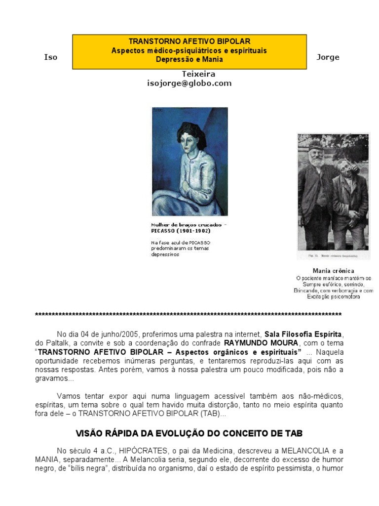 Depresso e !a"ia Iso Jorge Teixeira isojorge@globo.com ########################################################################################### No dia 04 de junho/2005, proferimos uma palestra na internet, Sa$a Fi$oso%ia Esp&rita, do Paltalk, a convite e sob a coordenao do confrade RA'!(NDO !O(RA, com o tema "TRANSTORNO AFETIVO BIPOLAR ) Aspectos or*+"icos e espirituais, ... Naquela oportunidade recebemos inmeras perguntas, e tentaremos reproduzi-las aqui com as nossas respostas. Antes porm, vamos nossa palestra um pouco modificada, pois no a gravamos... Vamos tentar expor aqui numa linguagem acessvel tambm aos no-mdicos, espritas, um tema sobre o qual tem havido muita distoro, tanto no meio esprita quanto fora dele o TRANSTORNO AFETVO BPOLAR (TAB)... VIS-O R.PIDA DA EVOL(/-O DO 0ON0EITO DE TAB No sculo 4 a.C., HPCRATES, o pai da Medicina, descreveu a MELANCOLA e a MANA, separadamente... A Melancolia seria, segundo ele, decorrente do excesso de humor negro, de "blis negra, distribuda no organismo, da o estado de esprito pessimista, o humor triste e a lentido psquica e motora. E a MANA em sua acepo literal seria MPULSO, para ele, uma "loucura alegre, agitada e pitoresca . Por volta do final do sculo 19, o psiquiatra EML KRAEPELN juntou a Melancolia e a Mania num nico quadro nosolgico, chamado loucura manaco-depressiva ou PSCOSE MANACO-DEPRESSVA (PMD). Para KRAEPELN, a PMD seria um quadro cuja evoluo caracterizar-se-ia por FASES ora a fase de exaltao do humor (manaca), ora a fase de depresso do humor (depressiva) e entre cada fase haveria o chamado "intervalo lcido, isto , o paciente voltaria normalidade aps cada fase. A durao de cada fase varivel, em mdia de 4(quatro) meses... Em meados do sculo 20, com a descoberta de substncias antidepressivas e antimanacas, modificou-se um pouco a terminologia, embora pouco ou quase nada se acrescentou ao conceito. No obstante, o conceito de DEPRESSO ampliou-se muito, a nosso ver, propiciado pela venda cada vez maior de medicamentos. Optou-se, assim, pelo conceito de "transtorno, muito mais vago e amplo do que "PSCOSE, assim o conceito de PMD foi substitudo pelo conceito de Transtorno Afetivo Bipolar (TAB), mantendo-se praticamente a mesma descrio clnica, embora outras entidades foram catalogadas como transtornos: a CCLOTMA e a DSTMA, sobre as quais no entraremos em detalhe pois escapam ao objetivo PRTCO desta nossa palestra, especialmente para espritas... 0A(SAS DO TAB O Transtorno Afetivo Bipolar (TAB) explicado como tendo causas CONSTTUCONAS, GENTCAS, BOQUMCAS e PSCOLGCAS. Assim, o TAB mais freqente no sexo feminino, no bitipo p&c"ico (pessoas com face arredondada ou em forma de escudo pentagonal, com importante desenvolvimento do tecido adiposo, gorduroso, enfim, pessoas com a conformao corporal "atarracada). Haveria uma alterao funcional dos nveis de SEROTONNA na terminao nervosa, isto , na sinapse neuronal haveria pouca serotonina fisiologicamente ativa e isto confirmado pela ao dos antidepressivos que agem fundamentalmente nos nveis das aminas cerebrais... Do ponto de vista psicolgico, FREUD fez um trabalho importante ao distinguir a "Melancolia do "Luto, em 1913, isto , demonstrou que na Depresso h perda importante da auto-estima, levando freqentemente aos suicdios tentados ou consumados, o que no ocorreria no Luto, isto , na Tristeza normal. J a psicanalista MELANE KLEN extrapolou ao conceber que haveria, no beb, uma posio depressiva, em que o beb no se distinguiria do seio materno, projetando "fantasias inconscientes para o seio: ora seio bom, ora seio mau e assim, merc dessas fantasias paranides, o Ego do beb sairia da POSO ESQUZOPARANDE, esvaziando-se, para a POSO DEPRESSVA. Na vida adulta, o individuo "regrediria a esta fase do desenvolvimento da libido. J a MANA seria explicada por M. KLEN como uma "defesa do Ego contra a depresso, o que seria verdadeiro na mania REATVA e no na MANA do TAB. A nosso ver, a interpretao psicanaltica kleiniana tanto da Depresso quanto da Mania seriam artificiosas, pois se j difcil conceber-se o NCONSCENTE infantil, como uma dimenso ntica de um beb, imagine-se uma "fantasia inconsciente! Alm disso, na Mania no h um "sorrir pra no chorar a euforia do manaco no denota ao observador um disfarce, uma defesa contra a depresso, especialmente, nos casos de evoluo sempre com fases manacas... TAB e OBSESS-O 2 O Transtorno Afetivo Bipolar (TAB), do ponto de vista esprita, seria um COMPROMSSO REENCARNATRO de reajuste e evoluo do Esprito, a nosso ver. No concordamos com a tese de alguns confrades que dizem ser a Depresso uma OBSESSO. A maioria que assim afirma, desconhece o que seja verdadeiramente a DEPRESSO, assim o Dr. ZAAS CLARO, que no mdico, escreveu um livro sobre o assunto ("Depresso Causas, conseqncias e tratamento", Casa Edit. O Clarim, 6 ed., Mato SP, Nov. / 99) e disse, dentre outras, a seguinte tolice: "O ressentimento uma das causas mais freqentes de depresso (op. cit. p. 78), ou seja, ele demonstra desconhecer o que seja "ressentimento e, muito menos, o que seja "depresso e, menos ainda, o que seja "causa de Transtorno mental!... A est o grande problema dos que no so mdicos escreverem sobre assunto mdico... TAB ) OS LEITORES E OS INTERNA(TAS PER1(NTA! E N2S RESPONDE!OS Vamos , ento, aproveitar trechos de um artigo que escrevemos no JORNAL ESPRTA, rgo da FEESP, em setembro/2000, Coluna SADE MENTAL, p. 7, respondendo a uma leitora, Sra. ROSE RBAS que, alis, estava presente em nossa palestra na Sala FLOSOFA ESPRTA, em 04 de junho/2005 e, a seguir, resumir as principais perguntas dos internautas e as nossas respostas. Alis, estiveram presentes, em mdia 25 participantes "on line... Assim, recebemos mail , datado de 22/02/00, que dizia: "Dr. Iso, li seu artigo no Jornal Esprita (fev. 00), o qual achei muito instrutivo. Vemos atualmente um nmero enorme de pessoas com depresso e na casa esprita em que traalhamos, inmeros so os pedidos para indica!o de leituras e informa!"es sore depresso. #olicito ao #r. a indic