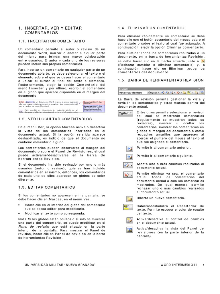 Marcas mostradas finales: Esta vista permite ver el documento final con todas las marcas de revisin y comentarios a la vista. sta es la vista predeterminada de todos los documentos abiertos en Word. Final: Esta vista permite ver el documento con todos los cambios realizados en el texto y sin que se muestren las marcas de revisin. Sin embargo, las marcas de revisin o los comentarios que no se hayan aceptado, rechazado o eliminado, permanecen en el documento. Marcas mostradas originales: Esta vista muestra el texto original con marcas de revisin y comentarios. Original: Esta vista muestra el documento original sin que aparezcan las marcas de revisin ni los comentarios. Sin embargo, las marcas de revisin o los comentarios que no se hayan aceptado, rechazado o eliminado, permanecen en el documento. Permite ver las modificaciones anteriores que se han hecho a un documento desde el punto donde este ubicado el puntero. Permite ver las modificaciones siguientes que se han hecho a un documento desde el punto donde este ubicado el puntero Cuando se desea aceptar un cambio. En este icono al lado derecho aparece una flecha que permite ver ms opciones entre las que