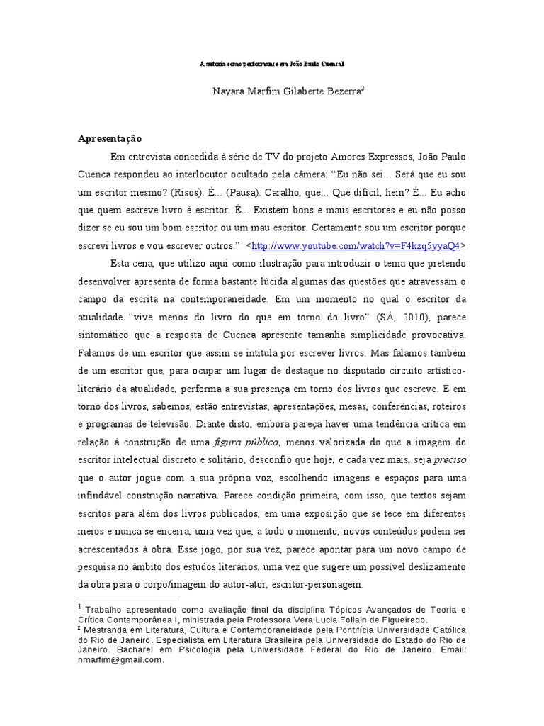 Apresentao Em entrevista concedida srie de TV do projeto Amores E pressos! "o#o $a%lo &%enca responde% ao interloc%tor oc%ltado pela c'mera( )E% n#o sei*** +er, -%e e% so% %m escritor mesmo. /0isos1* 2*** /$a%sa1* &aral3o! -%e*** 4%e dif5cil! 3ein. 2*** E% ac3o -%e -%em escreve livro escritor* 2*** E istem bons e ma%s escritores e e% n#o posso dizer se e% so% %m bom escritor o% %m ma% escritor* &ertamente so% %m escritor por-%e escrevi livros e vo% escrever o%tros*6 73ttp(88999*yo%t%be*com89atc3.v:;<=z->yya4<? Esta cena! -%e %tilizo a-%i como il%stra@#o para introd%zir o tema -%e pretendo desenvolver apresenta de forma bastante lAcida alB%mas das -%estCes -%e atravessam o campo da escrita na contemporaneidade* Em %m momento no -%al o escritor da at%alidade )vive menos do livro do -%e em torno do livro6 /+D! 2EFE1! parece sintom,tico -%e a resposta de &%enca apresente taman3a simplicidade provocativa* ;alamos de %m escritor -%e assim se intit%la por escrever livros* Mas falamos tambm de %m escritor -%e! para oc%par %m l%Bar de desta-%e no disp%tado circ%ito art5sticoG liter,rio da at%alidade! performa a s%a presen@a em torno dos livros -%e escreve* E em torno dos livros! sabemos! est#o entrevistas! apresenta@Ces! mesas! conferHncias! roteiros e proBramas de televis#o* Iiante disto! embora pare@a 3aver %ma tendHncia cr5tica em rela@#o constr%@#o de %ma figura pblica! menos valorizada do -%e a imaBem do escritor intelect%al discreto e solit,rio! desconfio -%e 3oje! e cada vez mais! seja preciso -%e o a%tor joB%e com a s%a prJpria voz! escol3endo imaBens e espa@os para %ma infind,vel constr%@#o narrativa* $arece condi@#o primeira! com isso! -%e te tos sejam escritos para alm dos livros p%blicados! em %ma e posi@#o -%e se tece em diferentes meios e n%nca se encerra! %ma vez -%e! a todo o momento! novos conteAdos podem ser acrescentados obra* Esse joBo! por s%a vez! parece apontar para %m novo campo de pes-%isa no 'mbito dos est%dos liter,rios! %ma vez -%e s%Bere %m poss5vel deslizamento da obra para o corpo8imaBem do a%torGator! escritorGpersonaBem*