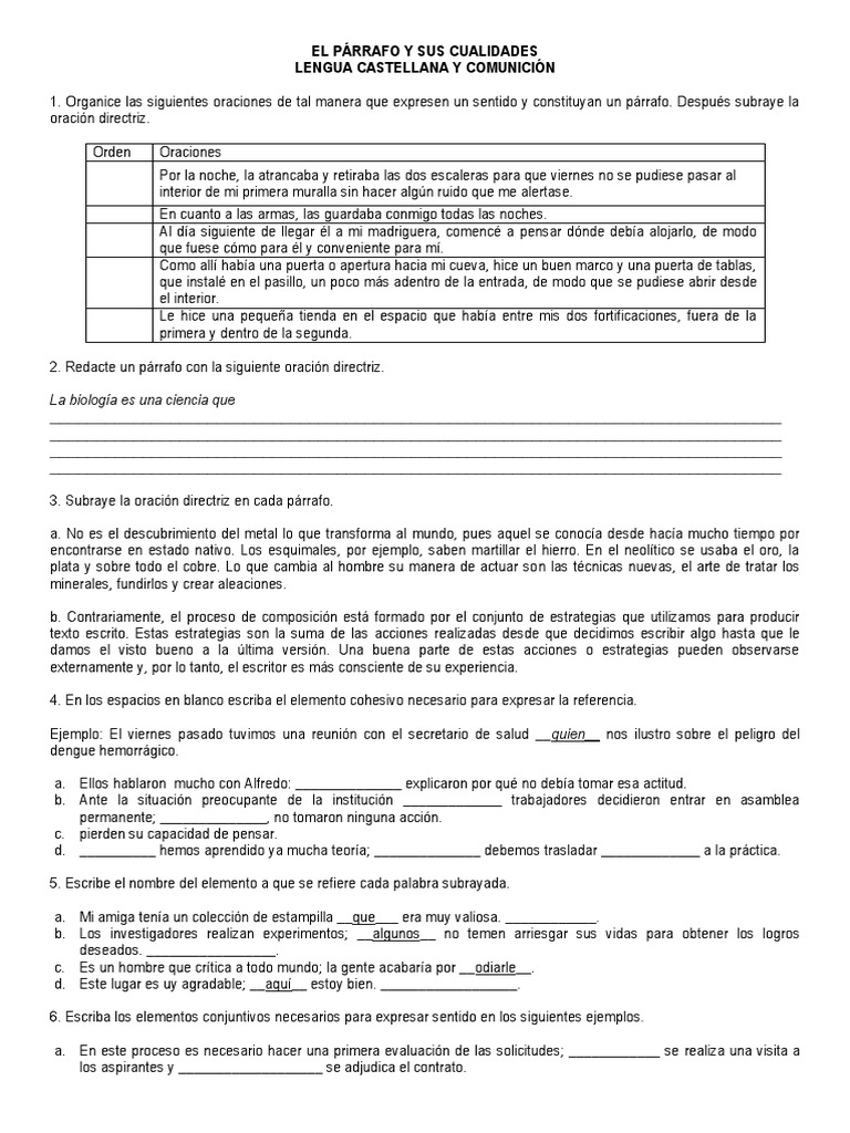 Organice las siguientes oraciones de tal manera que expresen un sentido y constituyan un prrafo. Despus subraye la oracin directriz. Orden Oraciones Por la noche, la atrancaba y retiraba las dos escaleras para que viernes no se pudiese pasar al interior de mi primera muralla sin hacer algn ruido que me alertase. En cuanto a las armas, las guardaba conmigo todas las noches. Al da siguiente de llegar l a mi madriguera, comenc a pensar dnde deba alojarlo, de modo que fuese cmo para l y conveniente para m. Como all haba una puerta o apertura hacia mi cueva, hice un buen marco y una puerta de tablas, que instal en el pasillo, un poco ms adentro de la entrada, de modo que se pudiese abrir desde el interior. Le hice una pequea tienda en el espacio que haba entre mis dos fortificaciones, fuera de la primera y dentro de la segunda. 2. Redacte un prrafo con la siguiente oracin directriz. La biologa es una ciencia que estudia los diferentes espacios de la biosfera. __________________________________ _______________________________________________________________________________ _______________________________________________________________________________ _______________________________________________________________________________ _______________________________________________________________________________ 3. Subraye la oracin directriz en cada prrafo. a. No es el descubrimiento del metal lo que transforma al mundo, pues aquel se conoca desde haca mucho tiempo por encontrarse en estado nativo. Los esquimales, por ejemplo, saben martillar el hierro. En el neoltico se usaba el oro, la plata y sobre todo el cobre. Lo que cambia al hombre su manera de actuar son las tcnicas nuevas, el arte de tratar los minerales, fundirlos y crear aleaciones. b. Contrariamente, el proceso de composicin est formado por el conjunto de estrategias que utilizamos para producir texto escrito. Estas estrategias son la suma de las acciones realizadas desde que decidimos escribir algo hasta que le damos el visto bueno a la ltima versin. Una buena parte de estas acciones o estrategias pueden observarse externamente y, por lo tanto, el escritor es ms consciente de su experiencia. 4. En los espacios en blanco escriba el elemento cohesivo necesario para expresar la referencia. Ejemplo: El viernes pasado tuvimos una reunin con el secretario de salud __ quien__ nos ilustro sobre el peligro del dengue hemorrgico. a. Ellos hablaron mucho con Alfredo: ______________ explicaron por qu no deba tomar esa actitud. b. Ante la situacin preocupante de la institucin _____________ trabajadores decidieron entrar en asamblea permanente; ______________, no tomaron ninguna accin. c. pierden su capacidad de pensar. d. __________ hemos aprendido ya mucha teora; ______________ debemos trasladar _____________ a la prctica. 5. Escribe el nombre del elemento a que se refiere cada palabra subrayada. a. Mi amiga tena un coleccin de estampilla __que___ era muy valiosa. ____________. b. Los investigadores realizan experimentos; __algunos__ no temen arriesgar sus vidas para obtener los logros deseados. _________________. c. Es un hombre que crtica a todo mundo; la gente acabara por __odiarle__. d. Este lugar es uy agradable; __aqu__ estoy bien. __________________. 6. Escriba los elementos conjuntivos necesarios para expresar sentido en los siguientes ejemplos. a. En este proceso es necesario hacer una primera evaluacin de las solicitudes; ____________ se realiza una visita a los aspirantes y ___________________ se adjudica el contrato.