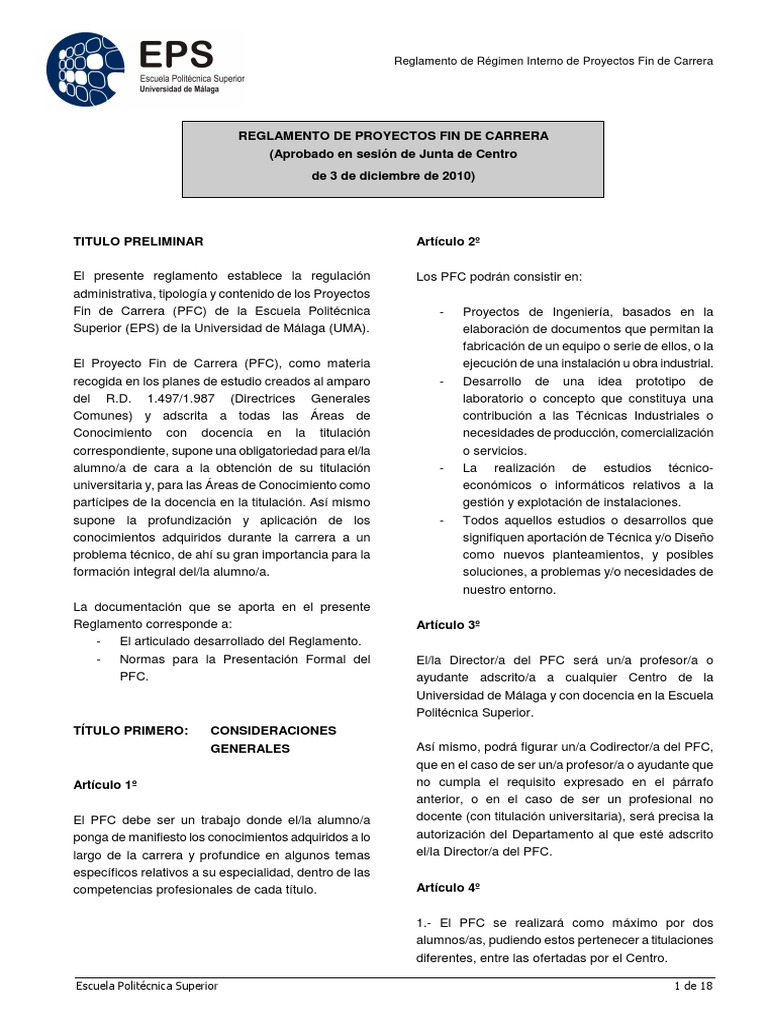TITULO PRELIMINAR El presente reglamento establece la regulacin administrativa, tipologa y contenido de los Proyectos Fin de Carrera (PFC) de la Escuela Politcnica Superior (EPS) de la Universidad de Mlaga (UMA). El Proyecto Fin de Carrera (PFC), como materia recogida en los planes de estudio creados al amparo del R.D. 1.497/1.987 (Directrices Generales Comunes) y adscrita a todas las reas de Conocimiento con docencia en la titulacin correspondiente, supone una obligatoriedad para el/la alumno/a de cara a la obtencin de su titulacin universitaria y, para las reas de Conocimiento como partcipes de la docencia en la titulacin. As mismo supone la profundizacin y aplicacin de los conocimientos adquiridos durante la carrera a un problema tcnico, de ah su gran importancia para la formacin integral del/la alumno/a. La documentacin que se aporta en el presente Reglamento corresponde a: - El articulado desarrollado del Reglamento. - Normas para la Presentacin Formal del PFC.