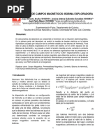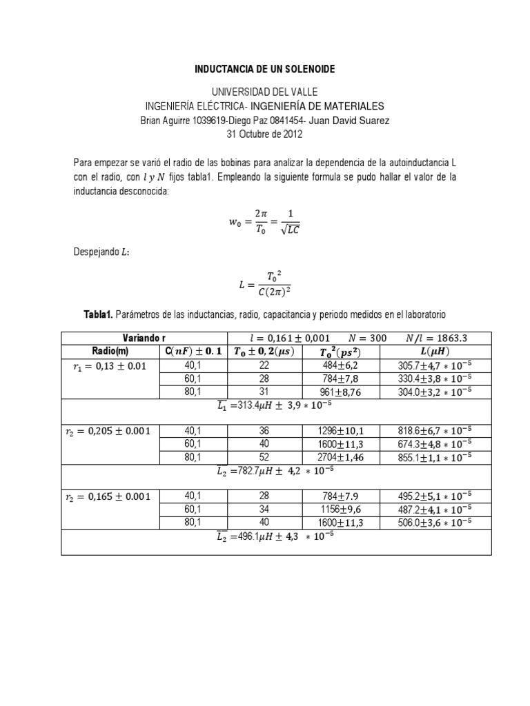 En los errores relativos de las tablas 3-4 se observa una diferencia entre los datos tericos y experimentales midiendo la precisin en la toma de datos, mostrando que los datos obtenidos al variar presentan una mayor dispersin a los que se obtuvieron al variar el radio, esto se puede explicar teniendo en cuenta que al tomar los datos de periodo en el osciloscopio, hay un error de apreciacin, adems puede haber un error instrumental en las capacitancias ya que se confi en el valor mostrado por ellas, ms no se midi los valores usados para el experimento. CONCLUSIONES En las figuras se puede observar que las autoinductancias tiene una dependencia cuadrtica, dependiendo del nmero de espiras que posea el solenoide, como tambin de su radio y de su longitud; esto es caracterstico de la frmula matemtica terica. Los valores de autoinductancia obtenidos experimentalmente son acorde a los establecidos por el fabricante, lo que implica que la ley de induccin de Faraday se cumple, en donde se induce una fem en una inductancia desconocida debido al cambio brusco de un campo magntico creado por otra bobina, con cuya frecuencia de oscilacin se puede obtener el valor de esta inductancia desconocida. Es muy importante tener en cuenta que a la hora de utilizar el osciloscopio como instrumento de medida de periodos, voltajes, entre otros datos, se presenta siempre un error de apreciacin que afecta en medida a los datos que se desean a obtener. Adems, si es posible, ser necesario medir el valor de las capacitancias utilizadas en el experimento en lugar de confiar en el valor que el fabricante determine, ya que esto tambin puede afectar los datos medidos y calculados.