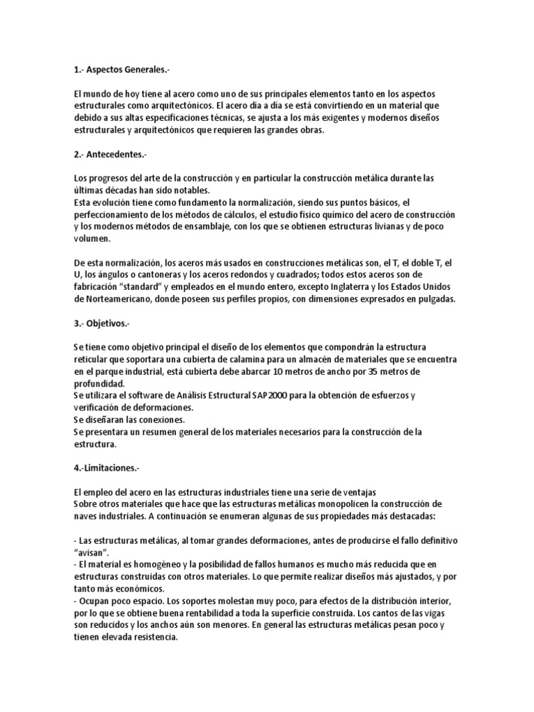 El mundo de hoy tiene al acero como uno de sus principales elementos tanto en los aspectos estructurales como arquitectnicos. El acero da a da se est convirtiendo en un material que debido a sus altas especificaciones tcnicas, se ajusta a los ms exigentes y modernos diseos estructurales y arquitectnicos que requieren las grandes obras. 2.- Antecedentes.Los progresos del arte de la construccin y en particular la construccin metlica durante las ltimas dcadas han sido notables. Esta evolucin tiene como fundamento la normalizacin, siendo sus puntos bsicos, el perfeccionamiento de los mtodos de clculos, el estudio fsico qumico del acero de construccin y los modernos mtodos de ensamblaje, con los que se obtienen estructuras livianas y de poco volumen. De esta normalizacin, los aceros ms usados en construcciones metlicas son, el T, el doble T, el U, los ngulos o cantoneras y los aceros redondos y cuadrados; todos estos aceros son de fabricacin standard y empleados en el mundo entero, excepto Inglaterra y los Estados Unidos de Norteamericano, donde poseen sus perfiles propios, con dimensiones expresados en pulgadas. 3.- Objetivos.Se tiene como objetivo principal el diseo de los elementos que compondrn la estructura reticular que soportara una cubierta de calamina para un almacn de materiales que se encuentra en el parque industrial, est cubierta debe abarcar 10 metros de ancho por 35 metros de profundidad. Se utilizara el software de Anlisis Estructural SAP2000 para la obtencin de esfuerzos y verificacin de deformaciones. Se disearan las conexiones. Se presentara un resumen general de los materiales necesarios para la construccin de la estructura. 4.-Limitaciones.El empleo del acero en las estructuras industriales tiene una serie de ventajas Sobre otros materiales que hace que las estructuras metlicas monopolicen la construccin de naves industriales. A continuacin se enumeran algunas de sus propiedades ms destacadas: - Las estructuras metlicas, al tomar grandes deformaciones, antes de producirse el fallo definitivo avisan. - El material es homogneo y la posibilidad de fallos humanos es mucho ms reducida que en estructuras construidas con otros materiales. Lo que permite realizar diseos ms ajustados, y por tanto ms econmicos. - Ocupan poco espacio. Los soportes molestan muy poco, para efectos de la distribucin interior, por lo que se obtiene buena rentabilidad a toda la superficie construida. Los cantos de las vigas son reducidos y los anchos an son menores. En general las estructuras metlicas pesan poco y tienen elevada resistencia.