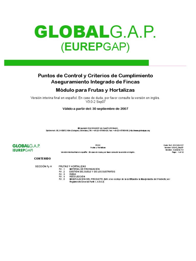 Versin Puntos de Control y Criterios de Cumplimiento 3.0-2_Sep07 Reemplaza 3.0-1_July07 Documento Nuevo reemplazado queda documento entra Descripcin de modificaciones realizadas sin efecto en vigor 30-Sep-07 30-Sep-07 Modificacin GLOBALGAP (EUREPGAP)
