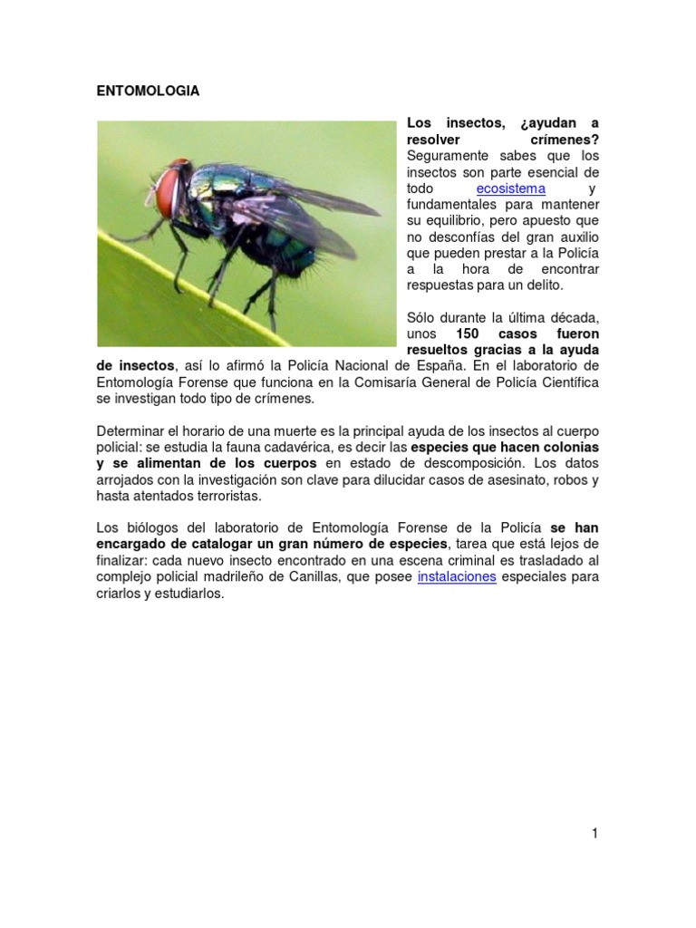 Seguramente sabes que los insectos son parte esencial de todo ecosistema y fundamentales para mantener su equilibrio, pero apuesto que no desconfas del gran auxilio que pueden prestar a la Polica a la hora de encontrar respuestas para un delito. Slo durante la ltima dcada, unos 150 casos fueron resueltos gracias a la ayuda de insectos, as lo afirm la Polica Nacional de Espaa. En el laboratorio de Entomologa Forense que funciona en la Comisara General de Polica Cientfica se investigan todo tipo de crmenes. Determinar el horario de una muerte es la principal ayuda de los insectos al cuerpo policial: se estudia la fauna cadavrica, es decir las especies que hacen colonias y se alimentan de los cuerpos en estado de descomposicin. Los datos arrojados con la investigacin son clave para dilucidar casos de asesinato, robos y hasta atentados terroristas. Los bilogos del laboratorio de Entomologa Forense de la Polica se han encargado de catalogar un gran nmero de especies, tarea que est lejos de finalizar: cada nuevo insecto encontrado en una escena criminal es trasladado al complejo policial madrileo de Canillas, que posee instalaciones especiales para criarlos y estudiarlos.