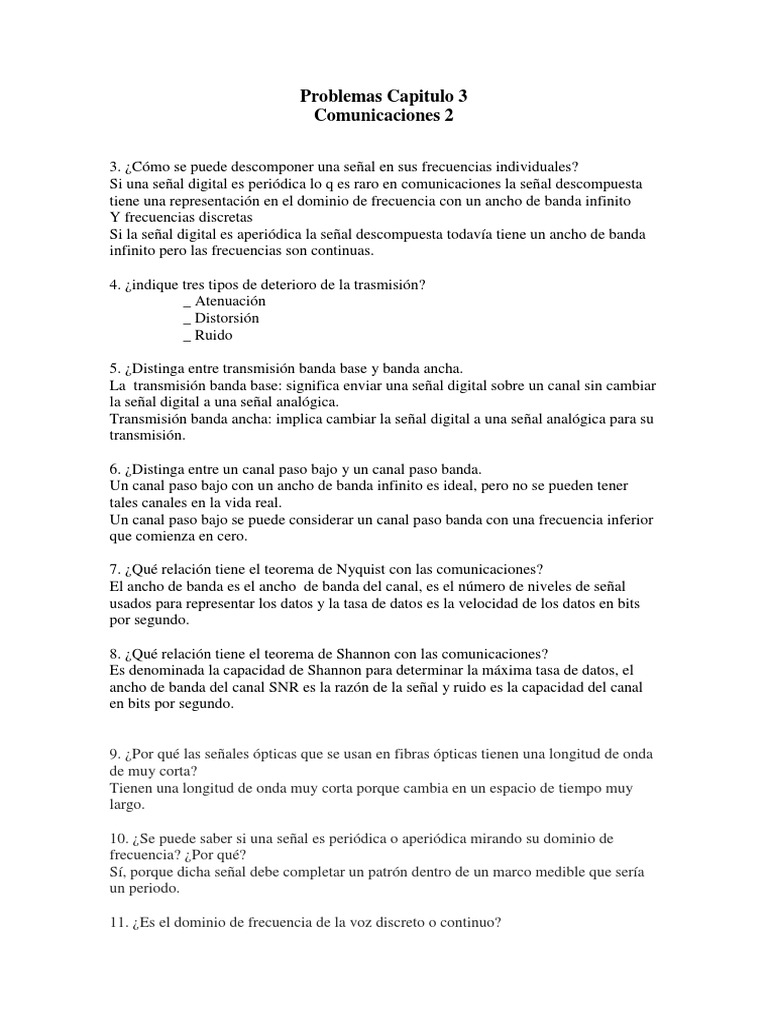 3. Cmo se puede descomponer una seal en sus frecuencias individuales? Si una seal digital es peridica lo q es raro en comunicaciones la seal descompuesta tiene una representacin en el dominio de frecuencia con un ancho de banda infinito Y frecuencias discretas Si la seal digital es aperidica la seal descompuesta todava tiene un ancho de banda infinito pero las frecuencias son continuas. 4. indique tres tipos de deterioro de la trasmisin? _ Atenuacin _ Distorsin _ Ruido 5. Distinga entre transmisin banda base y banda ancha. La transmisin banda base: significa enviar una seal digital sobre un canal sin cambiar la seal digital a una seal analgica. Transmisin banda ancha: implica cambiar la seal digital a una seal analgica para su transmisin. 6. Distinga entre un canal paso bajo y un canal paso banda. Un canal paso bajo con un ancho de banda infinito es ideal, pero no se pueden tener tales canales en la vida real. Un canal paso bajo se puede considerar un canal paso banda con una frecuencia inferior que comienza en cero. 7. Qu relacin tiene el teorema de Nyquist con las comunicaciones? El ancho de banda es el ancho de banda del canal, es el nmero de niveles de seal usados para representar los datos y la tasa de datos es la velocidad de los datos en bits por segundo. 8. Qu relacin tiene el teorema de Shannon con las comunicaciones? Es denominada la capacidad de Shannon para determinar la mxima tasa de datos, el ancho de banda del canal SNR es la razn de la seal y ruido es la capacidad del canal en bits por segundo.