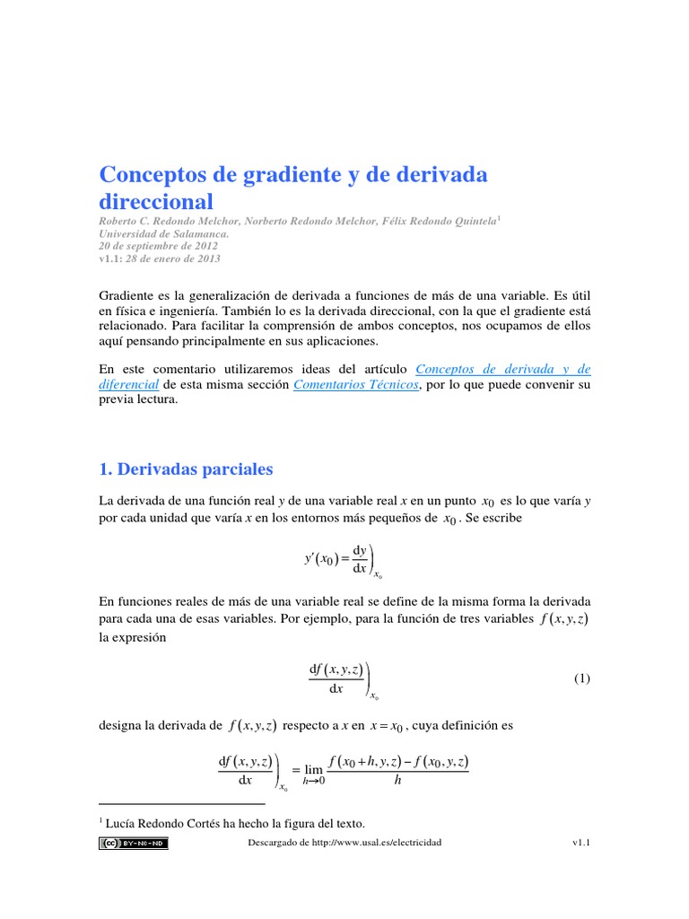 Gradiente es la generalizacin de derivada a funciones de ms de una variable. Es til en fsica e ingeniera. Tambin lo es la derivada direccional, con la que el gradiente est relacionado. Para facilitar la comprensin de ambos conceptos, nos ocupamos de ellos aqu pensando principalmente en sus aplicaciones. En este comentario utilizaremos ideas del artculo Conceptos de derivada y de diferencial de esta misma seccin Comentarios Tcnicos, por lo que puede convenir su previa lectura.