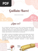 alteraciones son solo leves. La discapacidad grave solo aparece en aproximadamente el 10% al 15%de los pacientes. 3.13. Epidemiologia. Se trata de un proceso inflamatorio difuso de las partes proximales del SNP sin predileccin de edad y sexo, pero con mayor frecuencia entre los 50 y 74 aos. Su incidencia anual, en diferentes series extranjeras, vara entre 1 y 2 por 100000,entre nosotros se estima una incidencia anual por 100000, dato este que apoya la impresin clnica de que hay ms alta frecuencia de esta entidad en nuestro medio .Aunque la mayora de los casos son espordicos , se han descrito brotes epidmicos como el de Itagui (Ant)en 1968 con 17 casos de adolecentes y adultos jvenes , el de El-SultJordania (1976)y el de [Link] el mismo ao, secundario a la vacunacin contra la influencia porcina . En los ltimos aos se han descrito nuevos subgrupos algunos de ellos de caractersticas axonales. Asi se observan: 1. Formas agudas como el sndrome de Guilain Barre o polirradiculoneuropatia aguda inflamatoria desmielinizante. La neuropata axonal sensitiva-motora (AMSAN). 2. Formas crnica como la poliradiculoneuropatia desmielinizante crnica idioptica; la neupatia desmielinizante adquirida multifocal sensitiva (MADSAN) y la neupatia motora multifocal (NMM). 4. Conclusin. Luego de buscar informacin acerca del sndrome de Guillain Barr conclu que es una enfermedad grave del sistema nervioso perifrico que puede afectar a cualquier persona ya sea joven o adulta, hombre o mujer; en la cual los nervios de las piernas y brazos se inflaman y dejan de funcionar. Esto causa debilidad repentina provocando parlisis y prdida de sensaciones y a veces dolor. En la actualidad no se sabe porque el Sndrome de GuillainBarr afecta a algunas personas, lo que s se sabe es que el sistema inmunolgico del cuerpo ataca al propio cuerpo. No es una enfermedad hereditaria ni contagiosa. Por otro lado, cerca del 60% de los pacientes sufren de infeccin de garganta o intestinal, influenza o sntomas de stress dos semanas previos. Estas infecciones gatillan una respuesta incorrecta del sistema inmune que ataca a los nervios. La mayora de los pacientes (80%) tienen una recuperacin total. Muchos pasan 3 meses o ms en el hospital y tardan un ao en recuperarse. Este tema me parece muy interesante ya que es una enfermedad de la que nadie est exento. Hasta este momento no existe cura alguna conocida para el Sndrome de Guillain-Barr, pues ciertas terapias se limitan a disminuir la gravedad de la enfermedad y a acelerar la recuperacin de los pacientes. Por otro lado algunos pacientes no se recuperan completamente y sus secuelas pueden ser debilidad, hormigueos y ocasionalmente dolor. La muerte, rara vez ocurre (5%, mayormente ancianos). Por tanto es la causa ms frecuente de parlisis flcida no traumtica, es importante realizar un diagnostico precoz y oportuno. Tomando en cuenta sus antecedentes epidemiolgicos en cuanto edad, infecciones u otras anteriormente mencionadas. Ya que a pesar de tener un pronstico en general bueno; quedar un porcentaje de pacientes que requieran un manejo ms agresivo, necesitando de una unidad de cuidados intensivos. 5. bibliografa. ([Link] 1. ACOSTA Mara Ins, M CAIZA Jos, ROMANO Martin Fidel, sndrome de Guillain Barre,2007,disponible en: