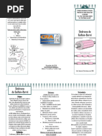 de lasmanos y de los pies. Los reflejos tendinosos profundos como el de la rodilla presentes en la mayora de las personas, estaban ausentes y, supuestamente, se haban perdido. Lamayora de los pacientes se recuper espontneamente con el tiempo. Algunos pacientes tenan problemas para respirar y un ritmo cardiaco anormal. Durante la etapa de convalecencia, la parlisis desapareci en orden inverso a su desarrollo: la mejora de la parte superior del cuerpo primero, seguida de la recuperacin de la fuerza en las piernas. Landry denomin el trastorno parlisis ascendente aguda. Se sumaron numerosos casos similares provenientes de otros pases. La demostracin de Quinke en 1891, en la que extrajo lquido cefalorraqudeo mediante la insercin de una aguja hipodrmica en la parte inferior de la espalda, prepar el camino para tres mdicos parisinos: Georges Guillain, Jean Alexander Barr y Andre Strohl. En 1916, estos mdicos reportaron la anomala caracterstica del SGB: concentracin elevada de protenas en el lquido cefalorraqudeo con un recuento celular normal. Los neurlogos llamaron a esto disociacin albumino-citolgica, lo que significa que el lquido contiene una cantidad normal de clulas indicado por el prefijo cito que se refiere a clulas, pero la cantidad de protenas o de la albmina en el lquido es anormalmente elevada (Guillain, 1916). Los estudios han demostrado que el trastorno puede afectar cualquiera de los nervios perifricos ya mencionados: motores, sensitivos y autnomos. El SGB es generalmente auto limitarse; es decir, la recuperacin empieza espontneamente. La mayora de los pacientes suele mejorar y a menudo se recupera por completo si, al debilitarse, sus funciones vitales como la respiracin, reciben los apoyos necesarios. El SGB suele ser una enfermedad monofsica; es decir, se presenta una sola vez. Las recurrencias son poco comunes. El problema subyacente en lamayora de los pacientes es el dao a la mielina que recubre los nervios perifricos (descrito a continuacin). Los nomb res diversos del SGB Al SGB se le conoce por otros nombres, entre ellos polineuropata desmielinizante inflamatoria aguda (PDIA) (aguda se refiere a que su aparicin es sbita; inflamatoria porque produce inflamacin en los nervios; desmielinizante para indicar que daa la capa exterior del nervio denominada mielina; polineuropata, un trastorno que afecta a muchos nervios); polineuropata inflamatoria aguda, polineuritis idioptica aguda (inflamacin, por tanto itis, de muchos nervios debido a causas idiopticas o desconocidas), polirradiculoneuritis idioptica aguda, parlisis ascendente de Landry, polineuropata disinmune aguda (dis indica algo nocivo, como se explica a continuacin); poliomielitis francesa, en alusin a los neurlogos que la reconocieron; y neuropata post infeccin (en vista de que en muchos casos se desarrolla despus de una infeccin). No obstante, en la actualidad, a este sndrome se le conoce comnmente como sndrome de Guillain-Barr o SGB. Qu es un sndrome? El trmino sndrome indica que el SGB se diagnostica identificando una combinacin especfica de manifestaciones caractersticas del trastorno. En el caso del SGB, se incluyen los sntomas (lo que el paciente siente y describe, tal como dificultad para caminar), seales (lo que se halla a travs de la exploracin fsica, como por ejemplo la falta de reflejos en las rodillas u otros reflejos tendinosos profundos), la evolucin clnica (debilitamiento que avanza de forma ascendente y rpida), junto con anlisis y pruebas que corroboran la enfermedad (por ejemplo, la conduccin lenta de las seales nerviosas, alta concentracin de protenas en el lquido cefalorraqudeo, etc.). 4 Tipos de nervios perifricos Una explicacin de la funcin del sistema nervioso perifrico ayudar a