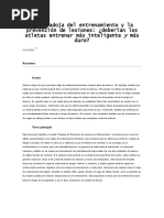 como propone Frade, la intensidad slo es caracterizada cuando se asocia a concentracin, por lo que propone valorar la exigencia de concentracin de cada situacin, la cual dependera del grado de dominio que se tiene de aquello que se est trabajando. Si hacemos un anlisis de todo lo expuesto hasta el momento, podemos observar que todas las mediciones de parmetros tradicionalmente tratados hacen referencia de forma ms o menos directa a la implicacin de los diferentes sistemas orgnicos y funcionales que se ponen en marcha en este deporte. Sin embargo, si atendemos a los factores que inciden en el rendimiento deportivo (Ehlenz, Groosser, Zimmermann, 1990: 13) hay otros como la tcnica, la tctica o los parmetros psquicos, no tratados hasta el momento. De esta forma, a la hora de evaluar las cargas aplicadas en un deporte de situacin, en el que todos los expertos coincidiran en afirmar que la tctica es un factor determinante en el rendimiento final, no podemos nica y exclusivamente circunscribir la evaluacin a los parmetros fisiolgicos, sino que debemos evaluar la carga tctica como el componente clave de este tipo de deportes (Refoyo, 2001, 2001a). La dificultad es un concepto que se ha valorado tradicionalmente de forma subjetiva por parte del entrenador. No obstante, entendemos que este componente de la carga determina en gran parte lo que los entrenadores determinan: la calidad del entrenamiento. En este sentido debemos resaltar que la dificultad conlleva el concepto de Carga Mental (Ruiz y Bauelos, 1997). El concepto de carga mental sera aquel que determinara un esfuerzo cognitivo para resolver los problemas tcticos presentados. En definitiva, es un trabajo perceptivo-cognitivo que realizan los jugadores a la hora de tomar decisiones en juego. PALABRAS CLAVE: ftbol, carga compleja, entrenamiento especfico. GUIN DE LA INTERVENCIN 1) Introduccin - Objetivos del control del entrenamiento. - Apartados del control de entrenamiento. - Criterios evaluacin en el control de entrenamiento en ftbol. - Instrumentos para el control del entrenamiento. 2) El carcter de la carga de entrenamiento en ftbol. 3) El conocimiento del juego y las interacciones e interrelaciones como elemento clave del control de la carga de entrenamiento. 4) Propuesta de criterios en el diseo de tareas y clasificacin de tareas en funcin de la carga de entrenamiento. 5) El lugar de los medios clsicos de control de la carga en el rendimiento de los deportes de equipo.