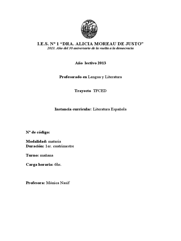 Selecci)& %e 2oe.$# %e 3$!cil$#o. So&eto#+ 45 4III5 6I 5 6III ' 66III. U&i%$% III+ 2arroco: caracter#sticas generales. Novelas Ejemplares !e Cer"antes: el entorno picaresco. /1inconete y Corta!illo0' /El licencia!o 6i!riera0' /El casamiento engaoso0 y /El colo,uio !e los perros0. *n&lisis !e las o$ras. Te1to# o/li*$to!io#: Ri&co&ete ' Co!t$%illo5 El lice&ci$%o 4i%!ie!$5 El c$#$.ie&to e&*$o#o ' El colo7(io %e lo# 2e!!o#. U&i%$% I4+ El 1omanticismo: caracter#sticas generales. El 1omanticismo espaol. Mariano 7os+ !e Larra: los $!t8c(lo# %e co#t(./!e#: "isin cr#tica !e la reali!a!. 5usta"o *!ol o 2+c,uer: las Leyendas: caracter#sticas. Lectura y an&lisis !e las o$ras. Te1to# o/li*$to!io#+ $!t8c(lo# %e L$!!$+ 4(elv$ (#te% .$$&$5 El .(&%o e# to%o .9#c$!$#5 Lite!$t(!$5 De l$ #9ti!$ ' lo# #$t8!ico#. 3(#t$vo A. :;c7(e!+ Leyendas <El monte !e las &nimas0' /El rayo !e luna0' /Los o%os "er!es0' /La cue"a !e la mora0.8 U&i%$% 4 La narrati"a espaola !el siglo 99: caracter#sticas generales. La 5uerra Ci"il : Re uiem !or un cam!esino es!aol !e 1amn (en!er. La semiosis !el secreto: Corazn tan blanco !e 7a"ier Mar#as. Te1to# o/li*$to!io#+ Re uiem !or un cam!esino es!aol. Coraz"n tan #lanco. U&i%$% 4 El te$t!o e#2$ol+ /!eve !e"e!e&ci$ $ l$ ,i#to!i$ %el te$t!o e& E#2$$. El tema !e la honra: /El castigo sin "engan.a0 :Lope !e 6ega8 La traicin y la honra: /La casa !e 2ernar!a *l$a0 !e Fe!erico 5arc#a Lorca. Te1to# o/li*$to!io#+ El c$#ti*o #i& ve&*$&=$ L$ c$#$ %e :e!&$!%$ Al/$ Mo%$li%$% %e Ev$l($ci)&+ Los alumnos !e$er&n cumplir con los re,uisitos !e asistencia- a!em&s' apro$ar una serie !e tra$a%os pr&cticos' !os por alumno' y un parcial para po!er acce!er al e)amen inal. Lo# $l(.&o# 7(e !i&%e& e& co&%ici)& %e li/!e# %e/e!9& %$! <e& l$ .e#$ e1$.i&$%o!$> 2!i.e!o (& e1$.e& e#c!ito5 %e c('$ $2!o/$ci)& %e2e&%e el $cce#o $ (&o o!$l.