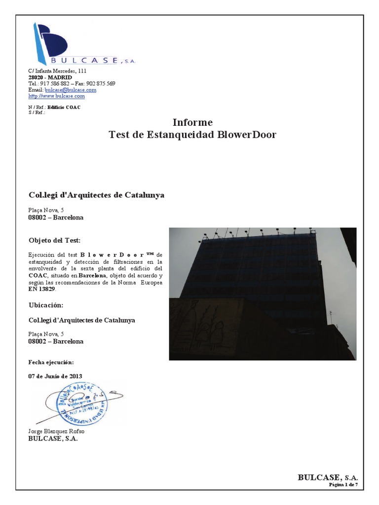 pruebas de despresurizacin en la sexta planta del edificio del COAC, situado en Barcelona, objeto del acuerdo y segn las