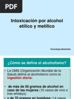 10. INTOXICACIN ALCOHLICA AGUDA El consumo de bebidas alcohlicas en las que la fermentacin del azcar ha producido alcohol, se remonta seguramente a varios milenios. Las bebidas destiladas de mayor concentracin alcohlica, son ms recientes. La intoxicacin aguda pasa por diversas fases que dependen de la concentracin de alcohol en la sangre. El alcohol es rpidamente absorbido por el tubo digestivo. Tomado en ayunas a los cinco minutos ya se perciben sus efectos. SNTOMAS Efectos sobre el sistema nervioso central, en el habla, en los reflejos, en la marcha, alteraciones de la conciencia. Mareos y vmitos. Paso de euforia inicial a un estado de confusa embriaguez que culmina en el coma (prdida de sensibilidad y reflejos).