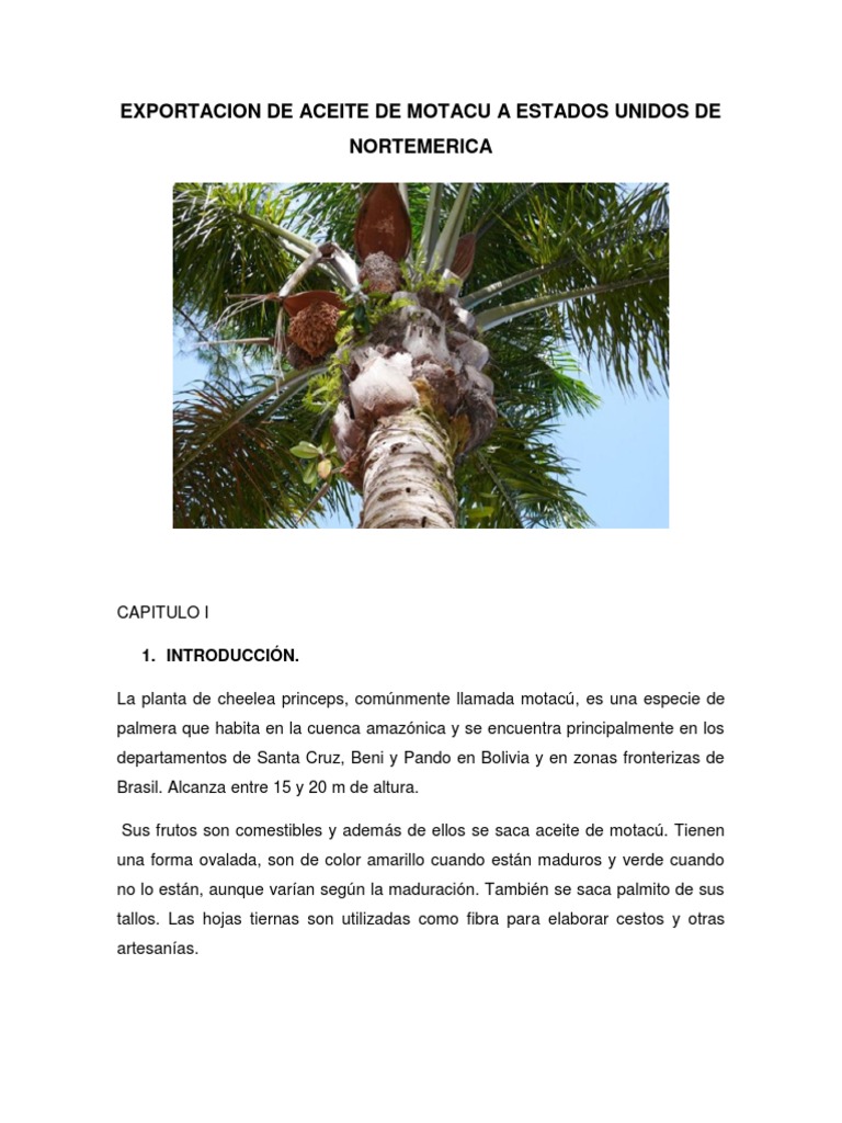 1.3.3. METAS. La meta propuesta por la empresa es posicionarse como los nmero uno de proveedores de Aceite de Motacu segn la demanda requerida por el mercado Estados Unidos exportando grandes cantidades de volmenes. CAPITULO II ESTUDIO DE MERCADO. 2.1. PRODUCTO DEL PROYECTO O SERVICIO DEL PROYECTO. 2.1.1 DESCRIPCION DEL PRODUCTO. De la palmera del motac extraen el delicioso palmito. Esta planta tiene varias utilidades, en su mayora desconocidas. Sus productos y usos se destacan uno tras otro ya que son aprovechados por las personas, animales y hasta la naturaleza agradece su existencia. Es un indicador de buen suelo. Cuando las personas ven un motac saben que es frtil y apto para el cultivo De usos variados. Attaleaphalerata es el nombre cientfico de esta especie rica en vitamina A y grasas insaturadas, explica el investigador. Es la fuente principal de cidos oleicos, sustancia que se utiliza para fines cosmticos y medicinales. Caractersticas. Sus frutos tienen forma ovoide y se presentan en racimos