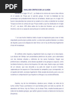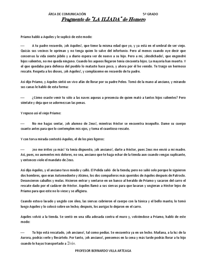 Pramo habl a Aquiles y le suplic de este modo: A tu padre recuerdo, oh Aquiles!, que tiene la misma edad que yo, y ya est en el umbral de ser viejo. Quizs sus vecinos le opriman y no tenga quien lo salve del infortunio. Pero al menos cuando oye decir que conservas la vida siente jbilo y a diario espera ver de nuevo a su hijo. Pero a m, desdichado!, que engendr hijos valientes, no me queda ninguno. Cuando los aqueos llegaron tena cincuenta hijos. La mayora han muerto. Y el que quedaba para defensa del pueblo lo mataste hace poco, y ahora por l he venido. Te traigo un hermoso rescate. Respeta a los dioses, oh Aquiles!, y complceme en recuerdo de tu padre. As dijo Pramo, y Aquiles sinti un vivo afn de llorar por su padre Peleo. Tom de la mano al anciano, y mirando sus canas le habl de esta forma: Cmo osaste venir tu slo a las naves aqueas a presencia de quien mat a tantos hijos valientes? Pero sintate y deja que se adormezcan las penas. Y repuso as el viejo Pramo: No me hagas sentar, oh alumno de Zeus!, mientras Hctor se encuentra insepulto. Dame su cuerpo cuanto antes para que lo contemplen mis ojos, y toma el cuantioso rescate. Y con torva mirada contest Aquiles, el de los pies ligeros: no me irrites ya ms! Ya tena dispuesto, oh anciano!, darte a Hctor, pues Zeus me envi a mi madre. As, pues, no aumentes mis dolores, no sea, anciano que te haga echar de la tienda aun cuando vengas suplicante, y entonces viole el mandato de Zeus. As dijo Aquiles, y el anciano tuvo miedo y call. El Pelida sali de la tienda; pero no sali solo porque le siguieron dos hombres, que eran Automedonte y Alcimo, los dos compaeros ms queridos de Aquiles despus de Patroclo. Desuncieron caballos y mulas. Hicieron entrar y sentarse en un banco al heraldo de Pramo y sacaron del carro el rescate dado por el cadver de Hctor. Aquiles llam a sus siervas para que lavaran y ungieran a Hctor lejos de Pramo para que este no lo viese y se afligiera. Cuando estuvo lavado y ungido con leo, las siervas cubrieron el cuerpo con la tnica y el bello manto; lo tom luego Aquiles y lo coloc sobre un lecho; despus, los aurigas lo dejaron en el carro. Aquiles volvi a la tienda. Se sent en una silla adosada contra el muro y, volvindose a Pramo, habl de este modo: Tu hijo est rescatado, oh anciano!, tal como pedas. Se encuentra ya en un lecho. Maana, a la luz de la Aurora, podrs verle y llevrtelo. Por tanto, oh anciano!, pensemos en la cena y ms tarde podrs llorar a tu hijo cuando lo hayas transportado a Ilin. PROFESOR BERNARDO VILLA ARTEAGA